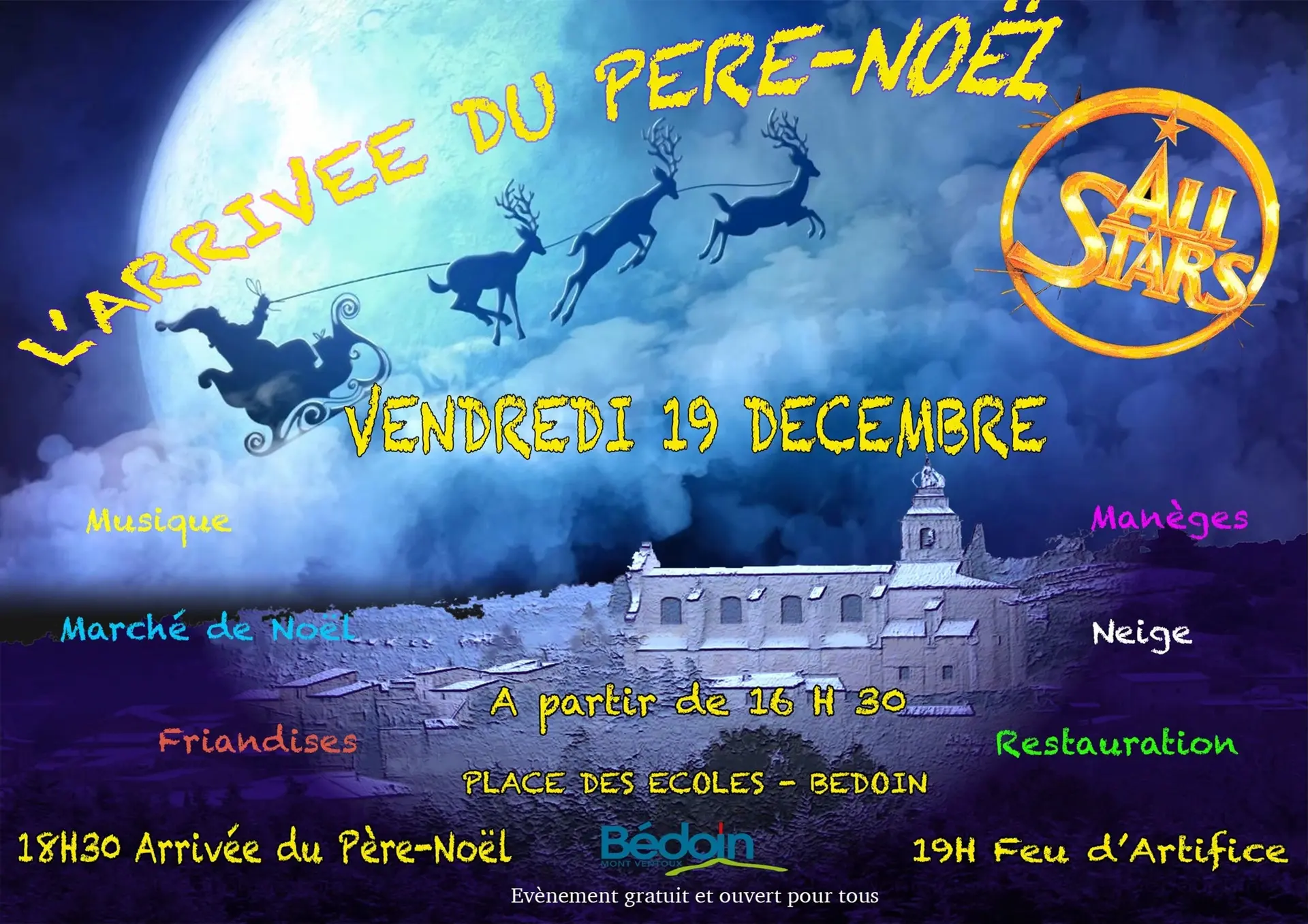 Sur une place illuminée pour l'occasion et décorée tel un village de Noël, avec canon à neige, musique, marché de noël, manèges. Venez déguster les mets confectionnés pour l'occasion : Choucroute de Noël, Chocolat Chaud, Vin Chaud, Crêpes, Coquillages, Bières de Noël. Profitez de ce grand moment féerique qui sera ponctué d'un Feu d'Artifice offert par la Ville de Bédoin !!