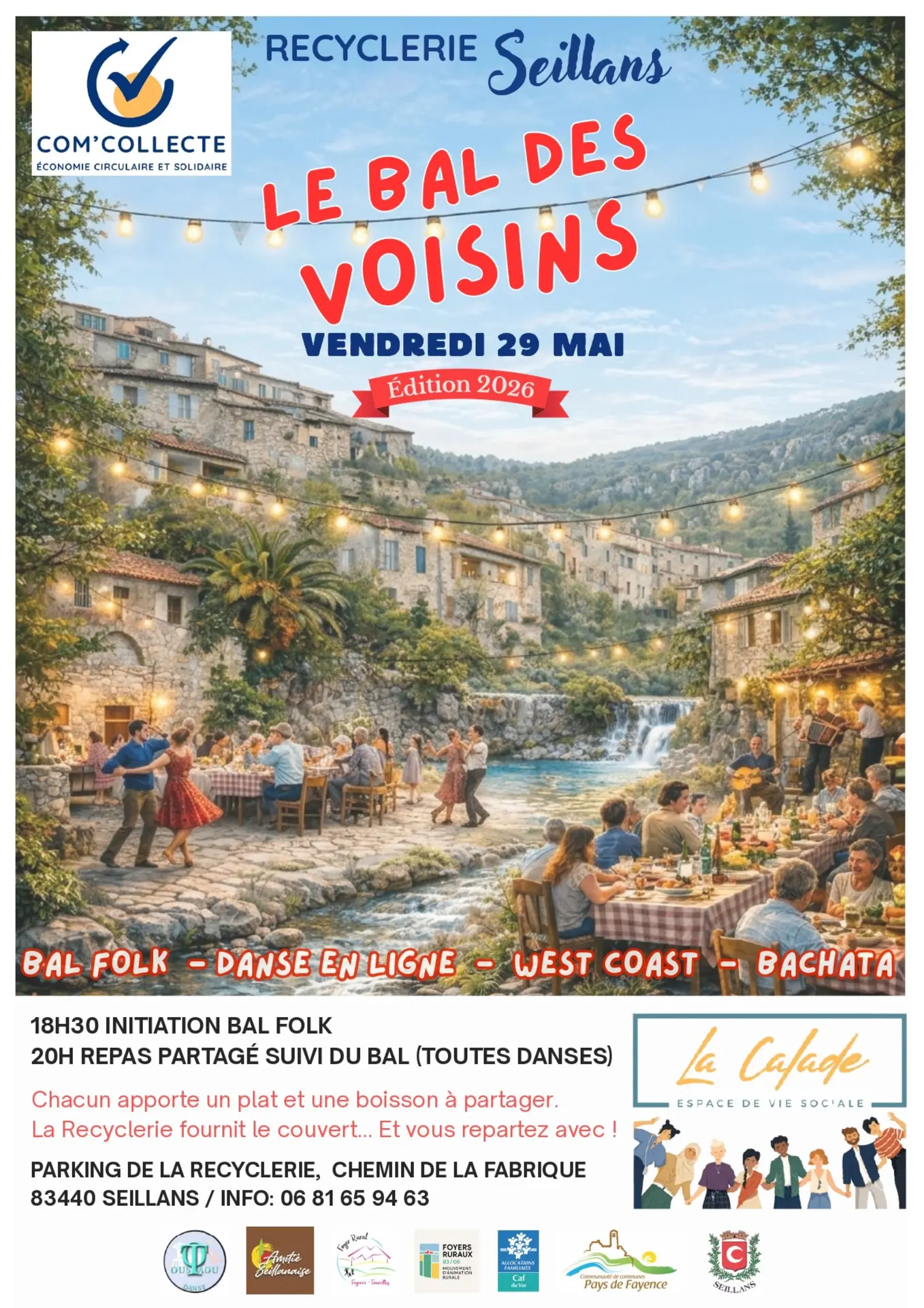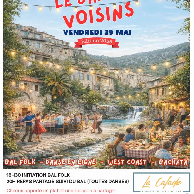 Chacun amène à boire et à manger, on partage un repas et on danse, c'est tout simplement le bal et la fête des voisins !! Ça commence à partir de 18h30 pour l'initiation au Folk, alors venez nombreux pour cette soirée festive. Dès 20h repas suivi du bal !