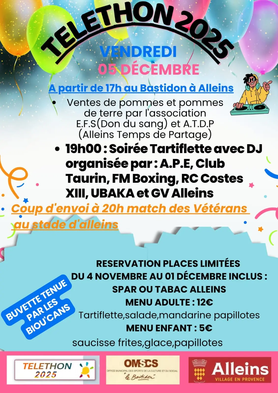 Soirée Tartiflette avec DJ : Participez à une soirée conviviale organisée par l’APE (Association des Parents d’élèves), le Club Taurin, FM Boxing, RC Costes XIII, UBAKA, GV Alleins (Gymnastique Volontaire) et les Biou’Cans
