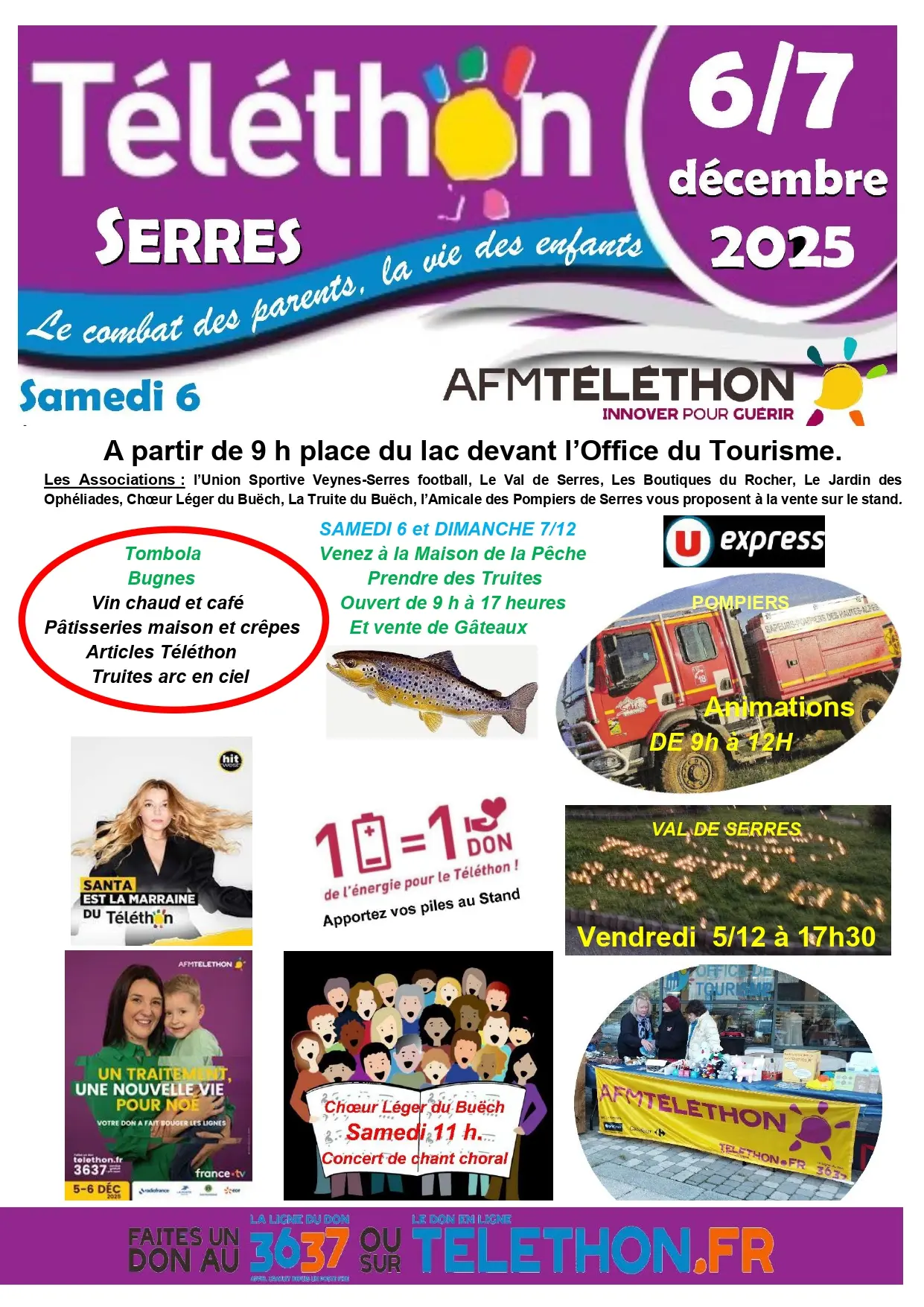 Cette année encore, le village de Serres se mobilise pour le Téléthon ! Vente de pâtisseries maison, crêpes, vin chaud et café, pâtisseries maison et crêpes, articles Téléthon, truites arc en ciel. Tombola. Animations pompiers de 9h à 12h.
