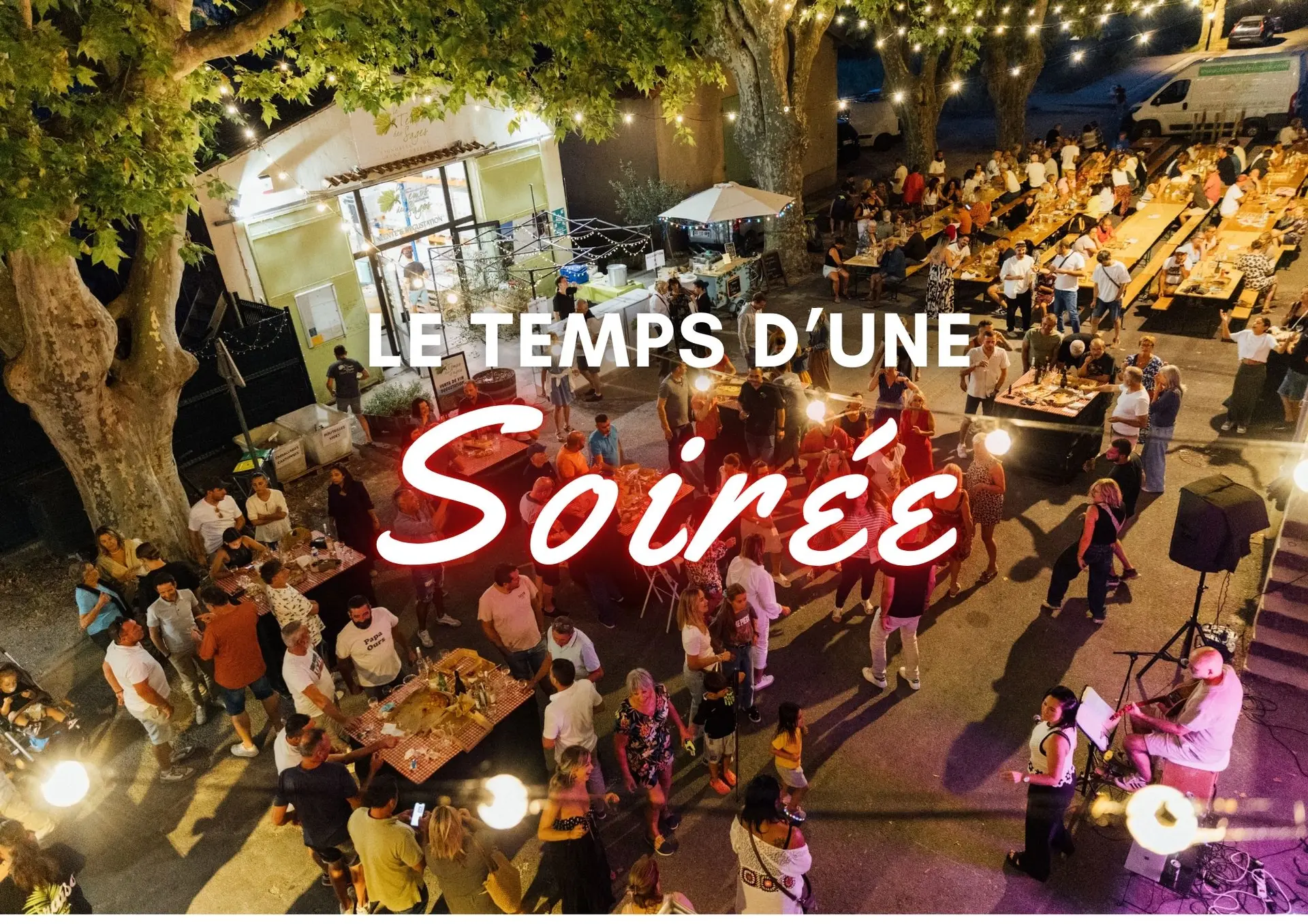 Rendez-vous devant la cave du Temps des Sages à Cabrières-d’Aigues pour une soirée festive en plein air, au pied du Luberon!