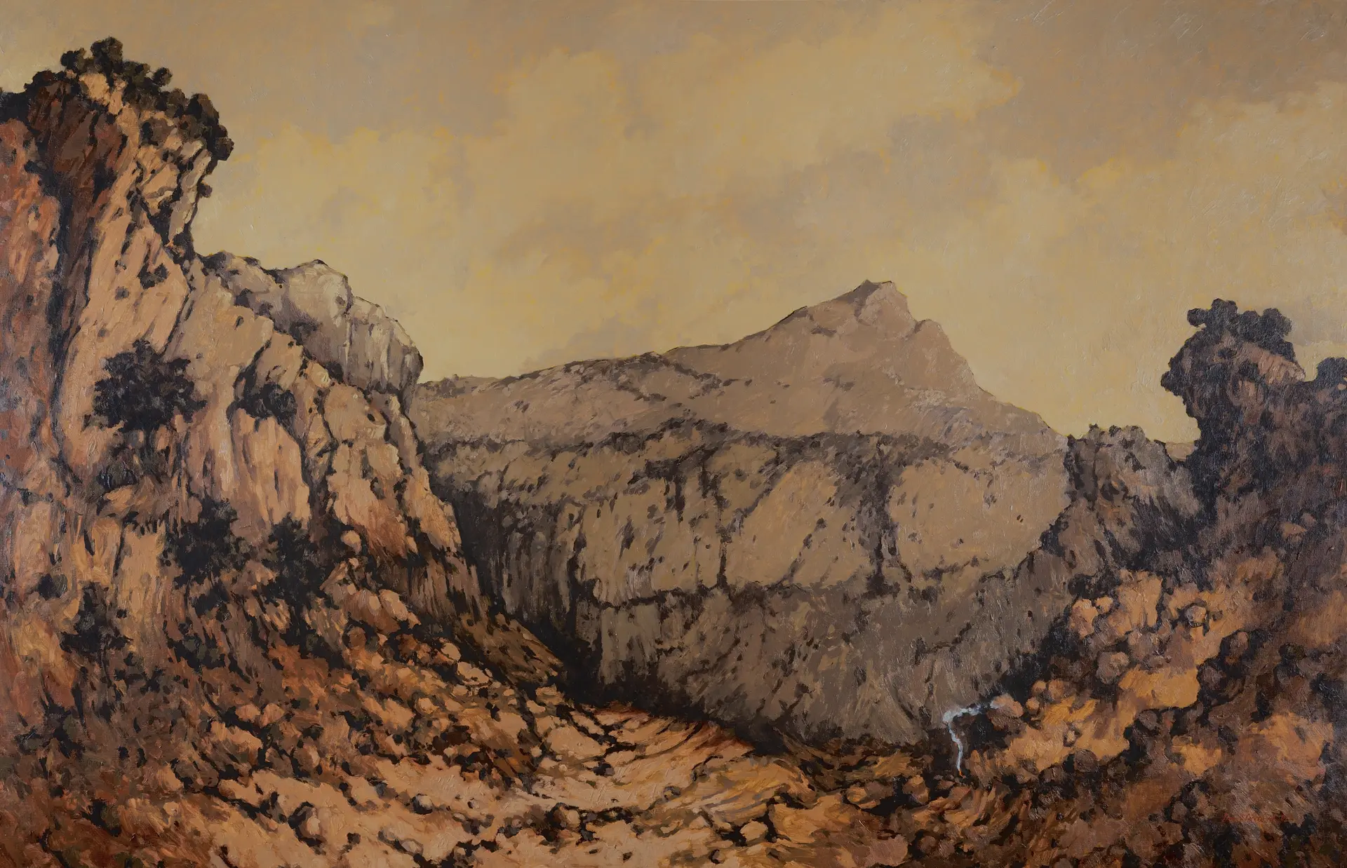 Dans une mansarde atelier, face à une toile placée sur la carcasse d’une chaise sans paillage aux pieds raccourcis, et avec le souvenir précis des moindres détails de cette Nature célébrée; le peintre*, presque anonyme, nous a laissé une oeuvre intitulée « Scène de chasse dans la combe du Bimont ». C’est un paysage grandiose avec la montagne Sainte-Victoire érigée en sentinelle sous un ciel d’automne brossé d’un jaune de souffre, c’est une peinture de roches chavirées et de terres trop oxydées, d’arbres tordus et de broussailles épineuses. Mais une fois la partie de chasse terminée et le feu de camp éteint ce tableau sera la dernière représentation de ce monde, l’ultime vision de ce vallon qu’une eau verte allait submerger.