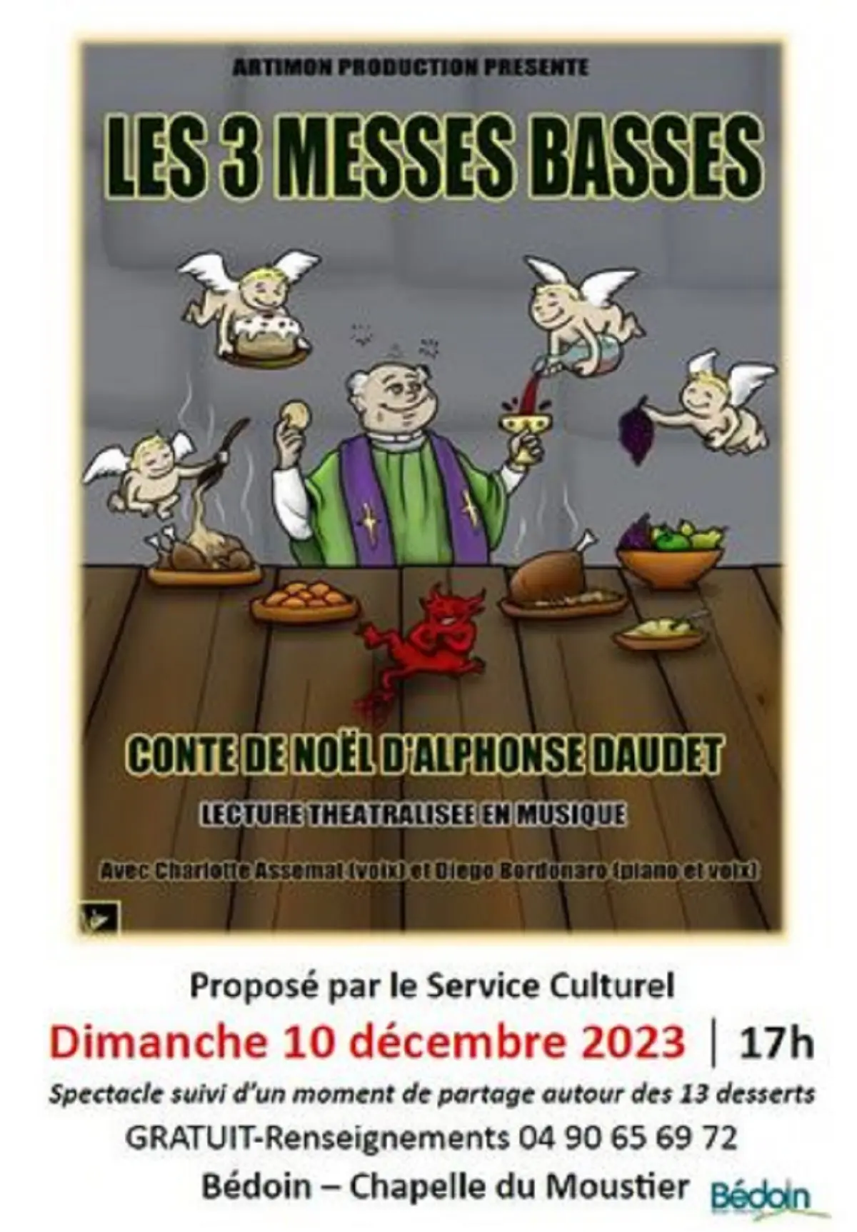 Ce conte intégré dans les Lettres de Mon Moulin en 1870 met en scène un prêtre, le révérend Dom Balaguère et son petit clerc Garrigou le soir de la messe de minuit. L'histoire se situe à la fin du XVIIè siècle dans un château provençal imaginaire situé en haut du Mont Ventoux. Tenté par le diable qui a pris les traits de son jeune sacristain, le révérend peine à dire ses messes tant il a hâte de déguster l'exquis menu du réveillon qui lui décrit son clerc avec de nombreux détails...! " Dégustation des 13 desserts à la fin du spectacle.