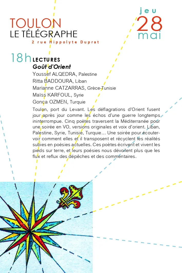 Cinq poètes traversent la Méditerranée pour une soirée en VO et voix d'orient. Liban, Palestine, Syrie, Tunisie, Turquie… Une soirée pour écouter/voir comment elles et il transposent et recyclent les réalités subies en poésies actuelles.