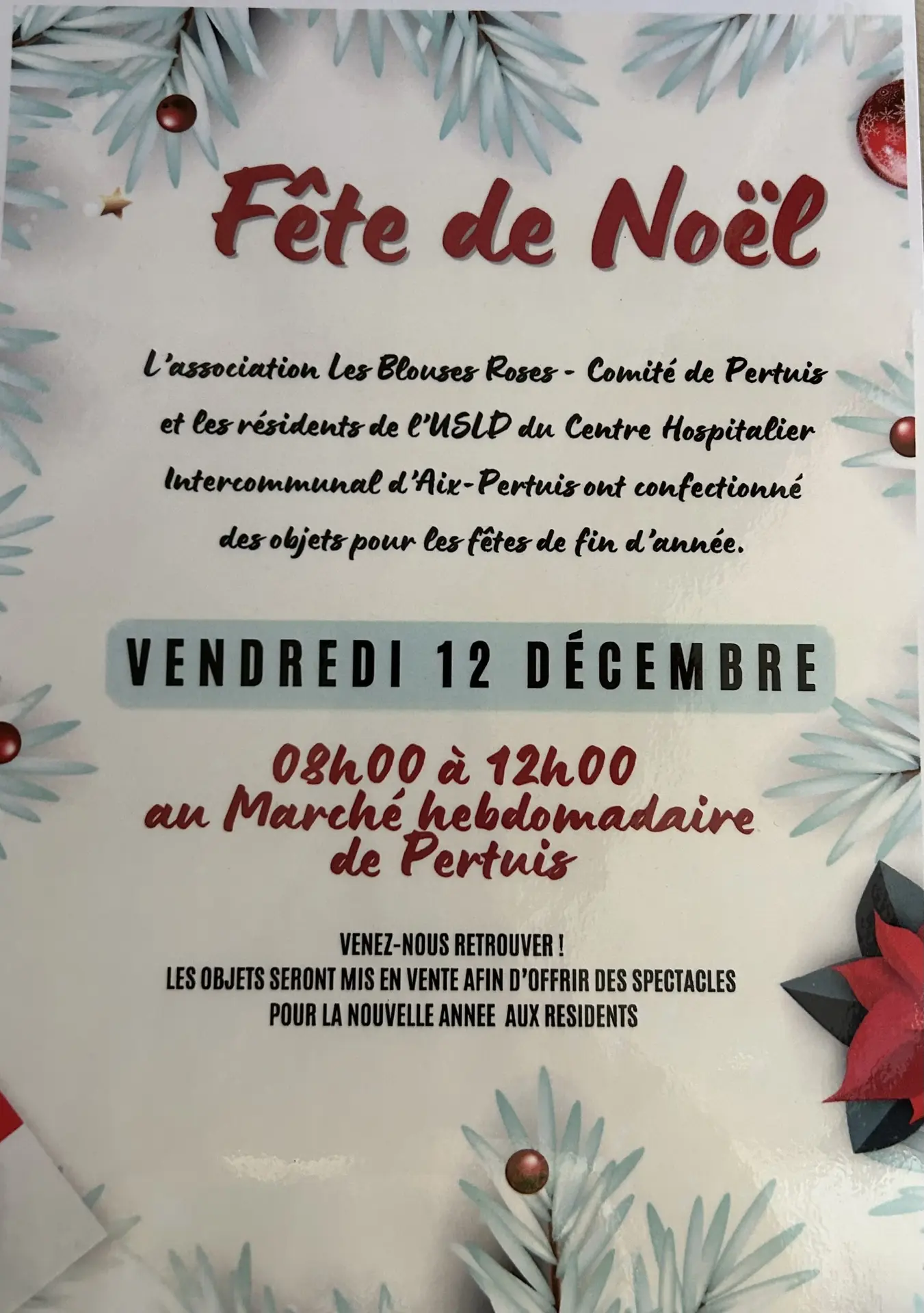Venez retrouver l'association Les Blouses Roses le vendredi 12 décembre sur le marché hebdomadaire de Pertuis de 8h00 à 12h00 .