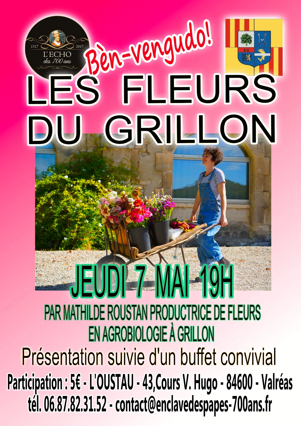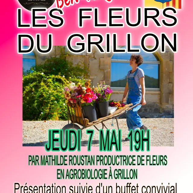 L'E.C.H.O. des 700 ans accueillera Mathilde Roustan productrice de fleurs en agrobiologie et talent de l'Enclave des papes à Grillon. La présentation de l'activité de notre invitée sera suivie d'un buffet convivial et du verre de l'amitié. Salle Oustau.