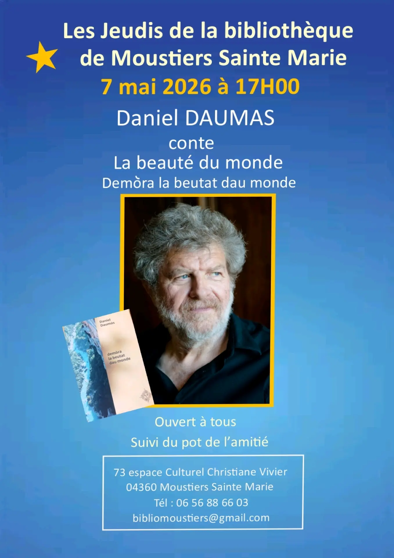 Jeudi 7 Mai 2026 à 17h , rendez-vous à la bibliothèque l'Oustaou dei Libre où Daniel Daumas vous contera la beauté du monde "Demora la beutat dau monde" !