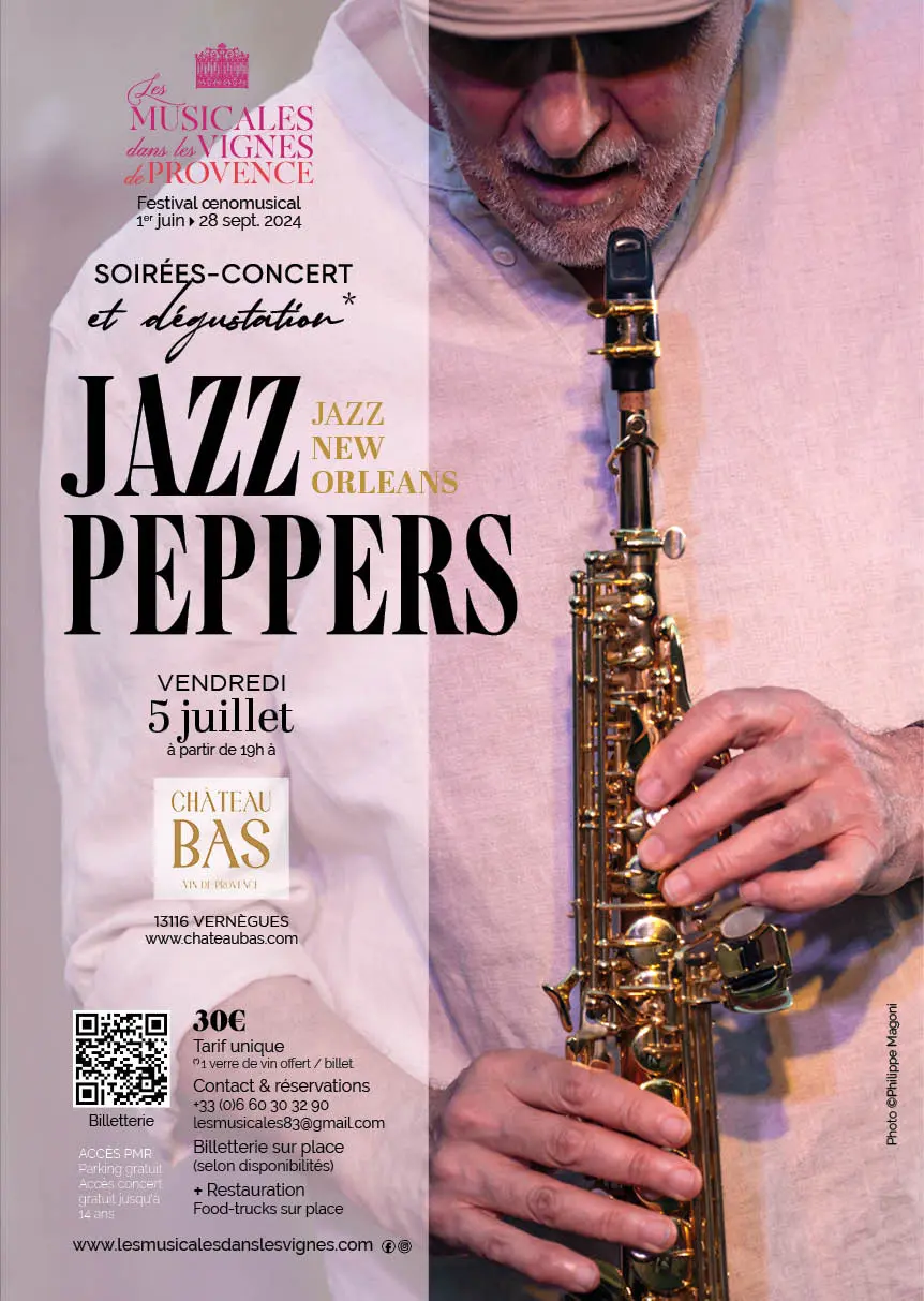 Venez célébrer le mariage du vin et de la musique lors de cette soirée -concert avec Jazz Peppers, jazz New Orleans.