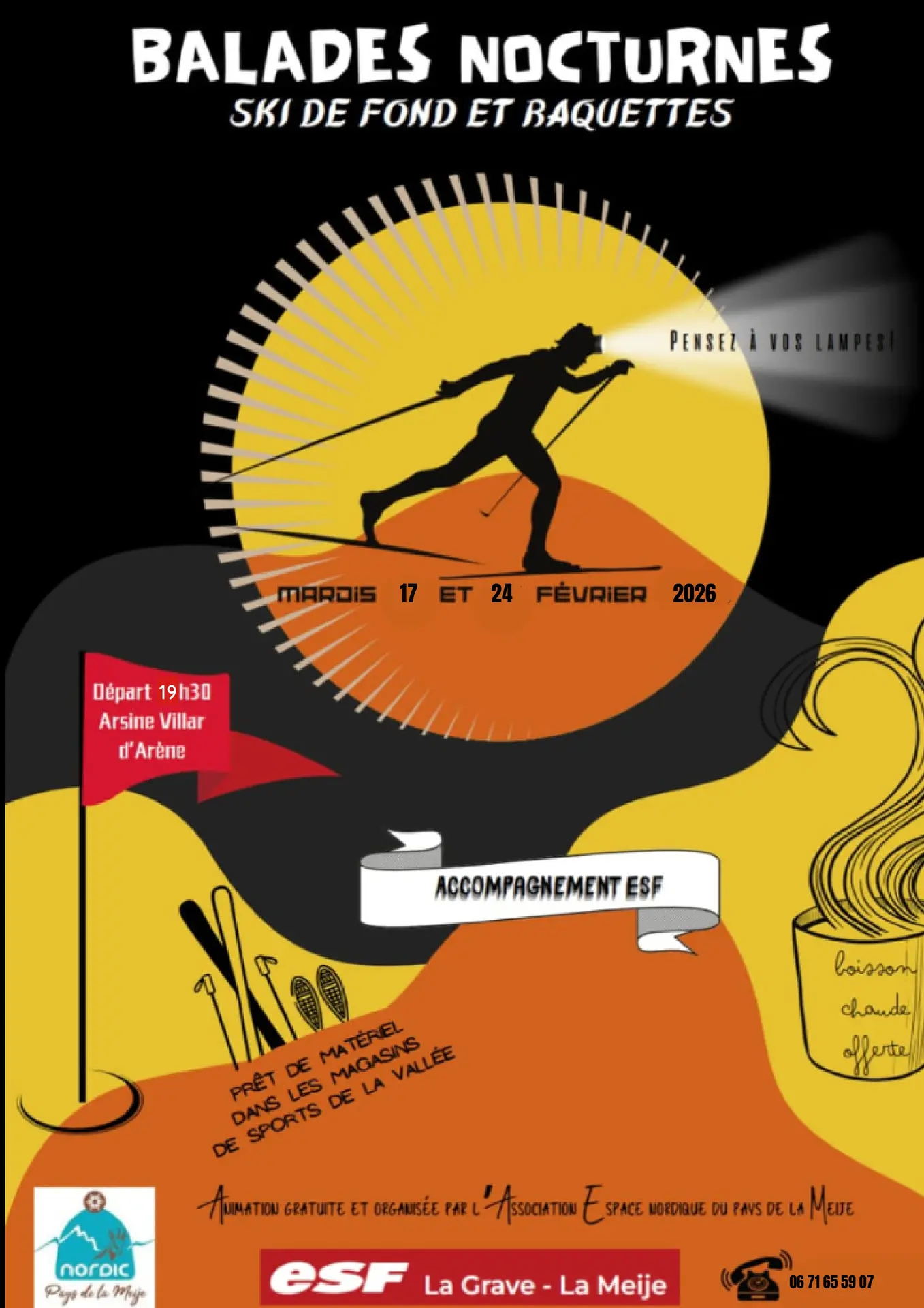 Rendez-vous au chalet d'accueil à Arsine mardi 17 et mardi 24 février. Départ à 19h30 muni :