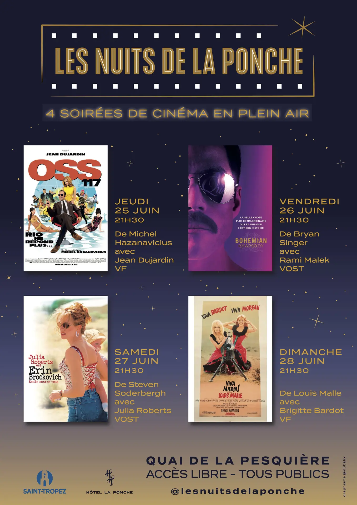 Avec cette seconde édition, l’association soutenue par la Mairie de Saint-Tropez et l’hôtel de la Ponche, est heureuse de proposer des soirées cinéma en plein air au cœur du village. Programmation annoncée au printemps 2026.