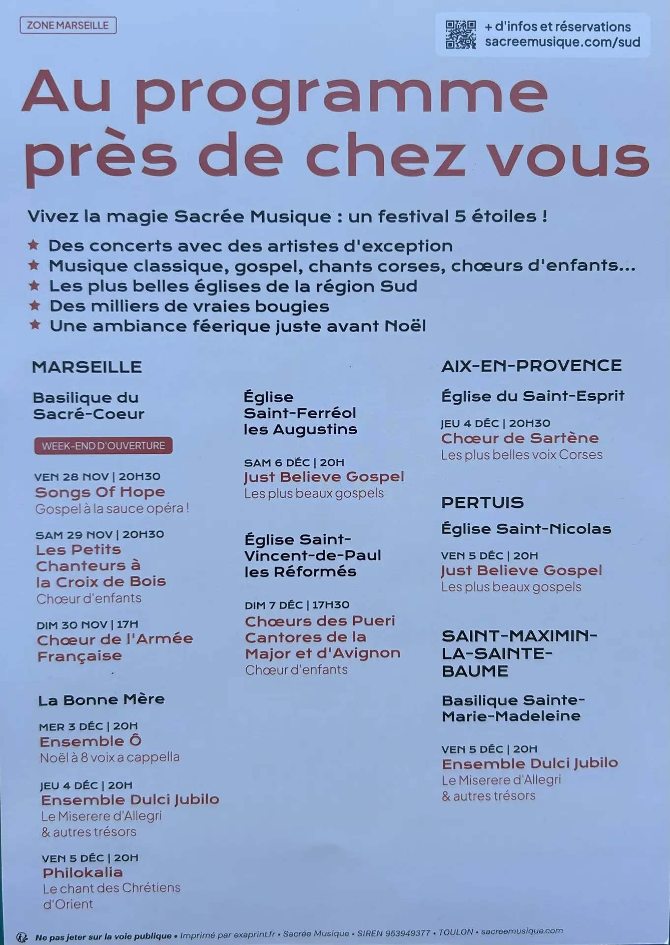 Possibilité de réserver directement à l'Office de Tourisme de Pertuis, via le site internet de Sacrée Musique