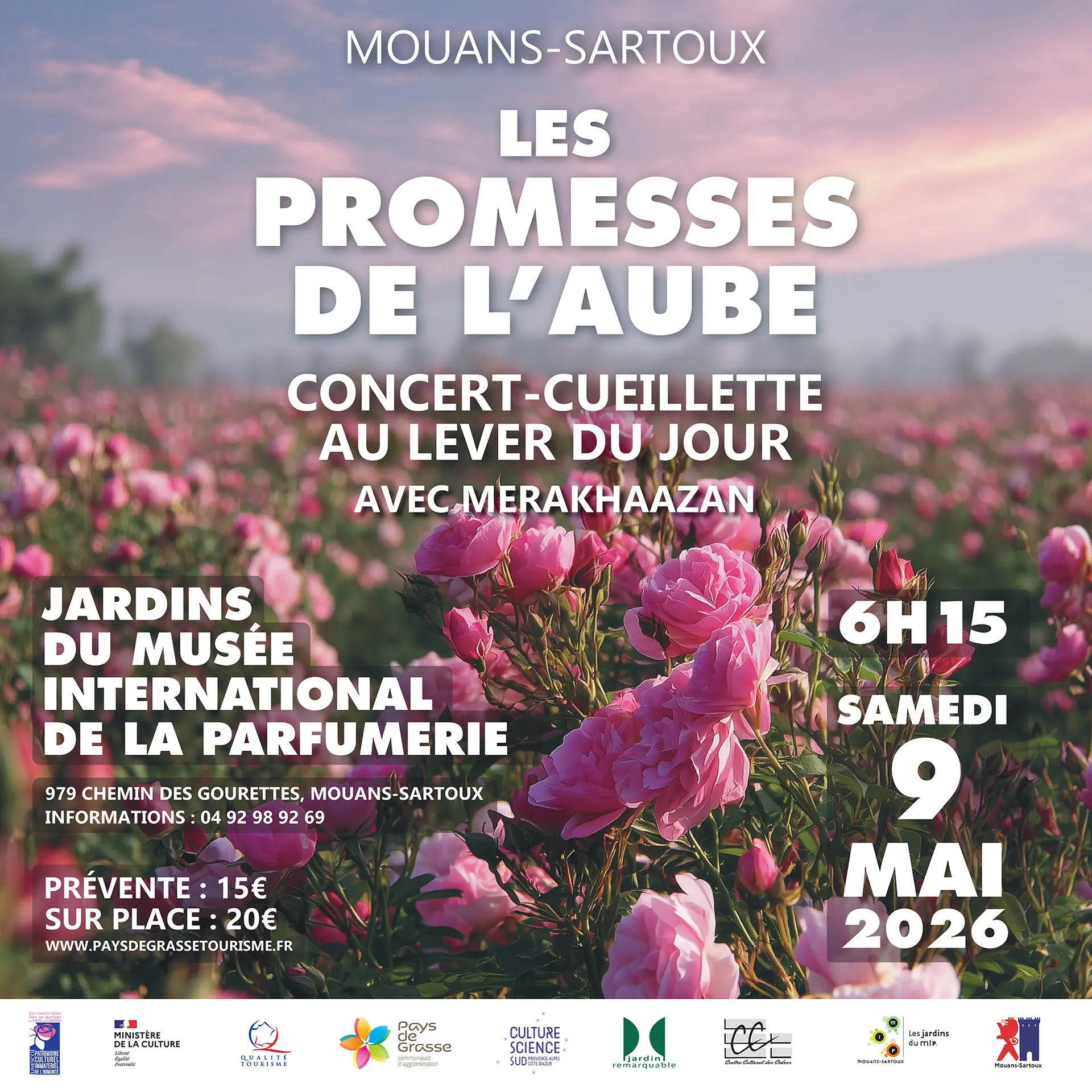 À l'aube, dans les jardins du MIP, vous serez guidés entre les rangées fleuries pour cueillir à la main cette rose emblématique de la parfumerie provençale, quand son parfum est à son apogée. Les doigts dans la rosée, café chaud en main, vous vivrez un geste ancestral avant de vous installer sur des chaises longues pour un concert avec l’artiste Merakhaazan.