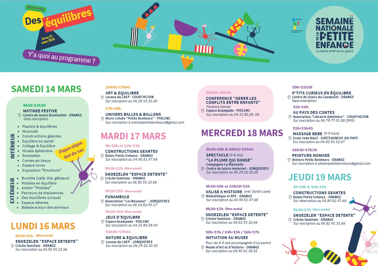 Pendant cette période, grâce notamment aux outils de communication et dossiers pédagogiques originaux mis à disposition gracieusement par l'association Agir pour la petite enfance, enfants, parents, familles et professionnels vont initier et participer à des ateliers, des conférences, des installations et des jeux d'éveil culturels et artistiques.