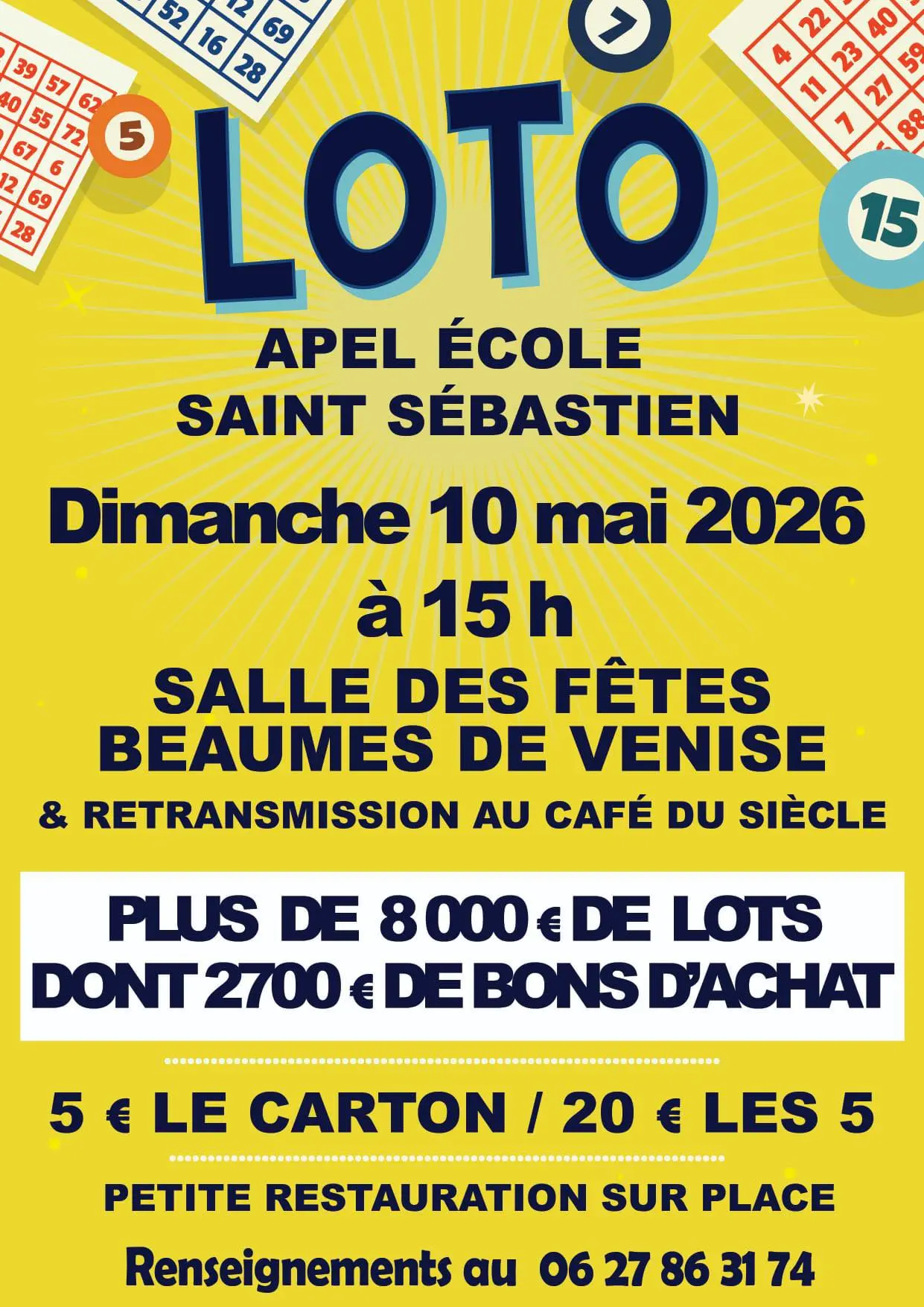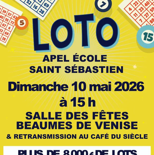L'école Saint Sébastien vous propose de passer un moment convivial lors de son loto. De nombreux lots sont à gagner dont 2700€ de bons d'achats ! Tirage à la Salle des Fêtes et retransmission au Café du Siècle.