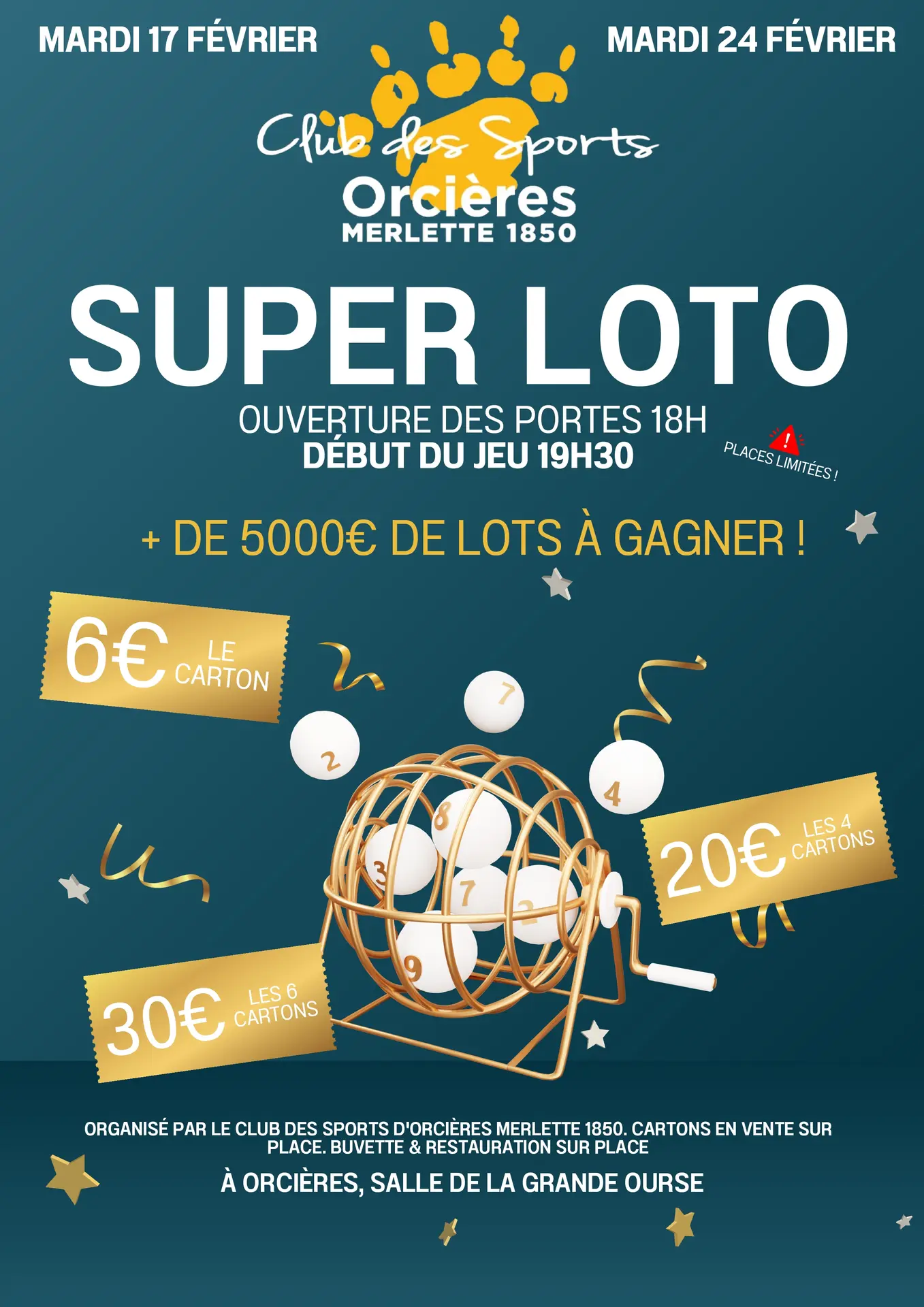 Organisé par le Club des Sports d'Orcières Merlette 1850, les membres de l'équipe vous convient pour une soirée au rythme des « Quine ! » des heureux gagnants ! Buvette et restauration sur place. Achat des cartons sur place. Plus de 5000€ de lots à gagner !