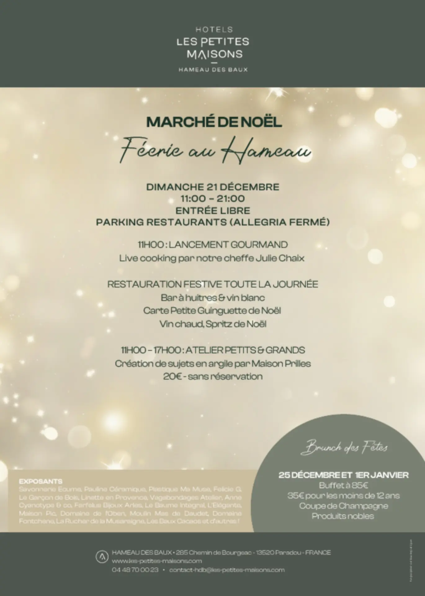 Exposants: Savonnerie Ecume, Pauline céramique, Plastique Ma Muse, Felicie G, Le Garçon de bois, Linette en Provence, Vagabondages Atelier, Anne Cyanotype & Co, Farfelus Bijoux Arles, Le Baume intégral, l'Élégante, Maison Pic, Domaine de l'Oben, Moulin Mas de Daudet, Domaine Fontchene, Le Rucher de la Musaraigne, Les Baux Cacaos et d'autres!