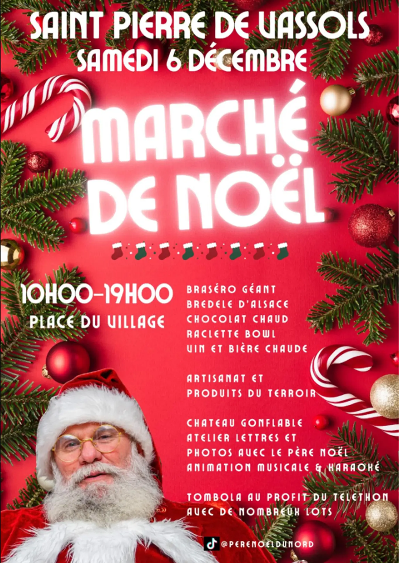 Le Marché de Noël de Saint Pierre de Vassols propose gourmandises, boissons chaudes, artisanat local, animations, château gonflable, photos avec le Père Noël et une tombola solidaire dans une ambiance chaleureuse.
