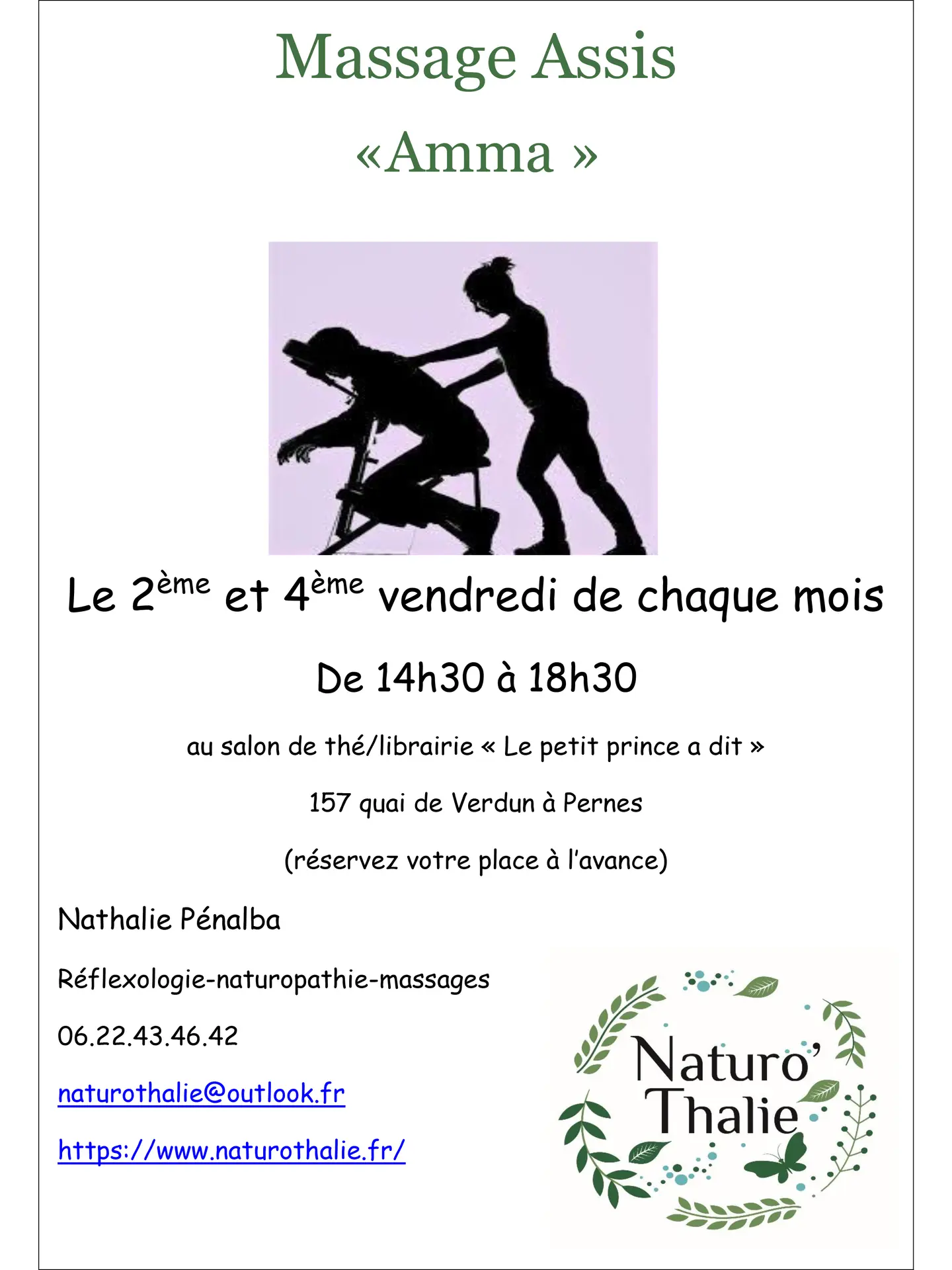 Naturo'Thalie vous propose un massage assis « Amma » (sur réservation). Venez en profiter le 16 juin 2023, puis RDV le deuxième et quatrième vendredi de chaque mois à partir du mois de juillet.