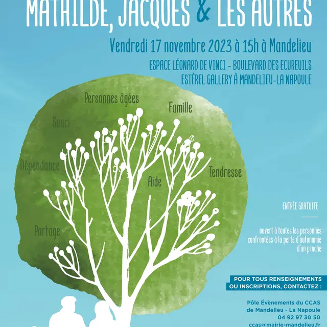 « Dans le cadre de la Politique Départementale d’Aide aux Aidants, le Département des Alpes-Maritimes en collaboration avec le CCAS de Mandelieu-La Napoule organise le 17 Novembre 2023 à 15H, la pièce de théâtre gratuite « Mathilde, Jacques et les autres » à l’Espace Liberté
