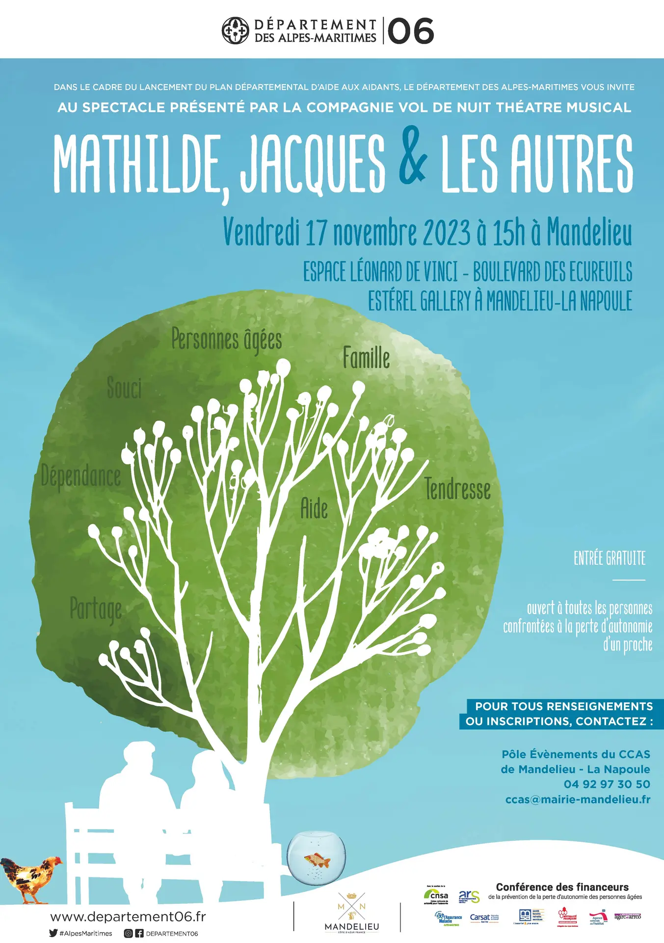 « Dans le cadre de la Politique Départementale d’Aide aux Aidants, le Département des Alpes-Maritimes en collaboration avec le CCAS de Mandelieu-La Napoule organise le 17 Novembre 2023 à 15H, la pièce de théâtre gratuite « Mathilde, Jacques et les autres » à l’Espace Liberté