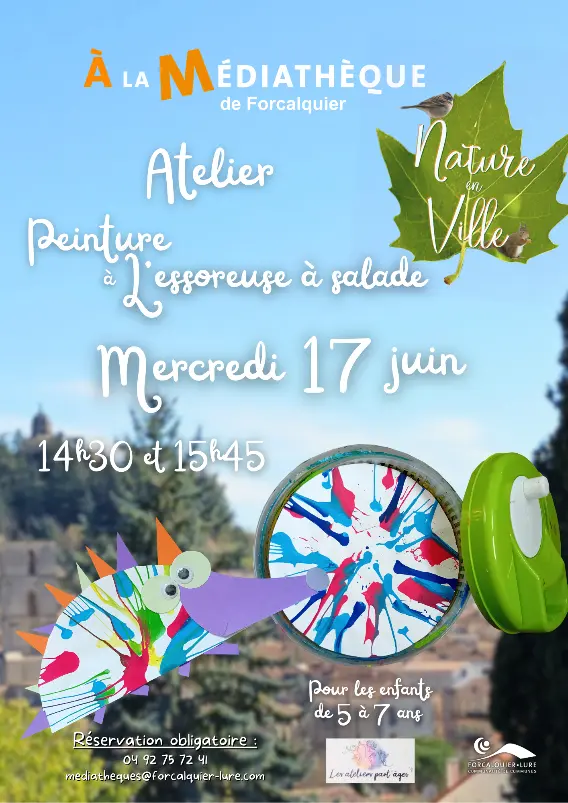 Découvrez un atelier créatif à la Médiathèque de Forcalquier ! Le mercredi 17 juin, deux sessions (14h30 et 15h45) pour les 5-7 ans. Une activité originale mêlant nature, peinture et... une essoreuse à salade !