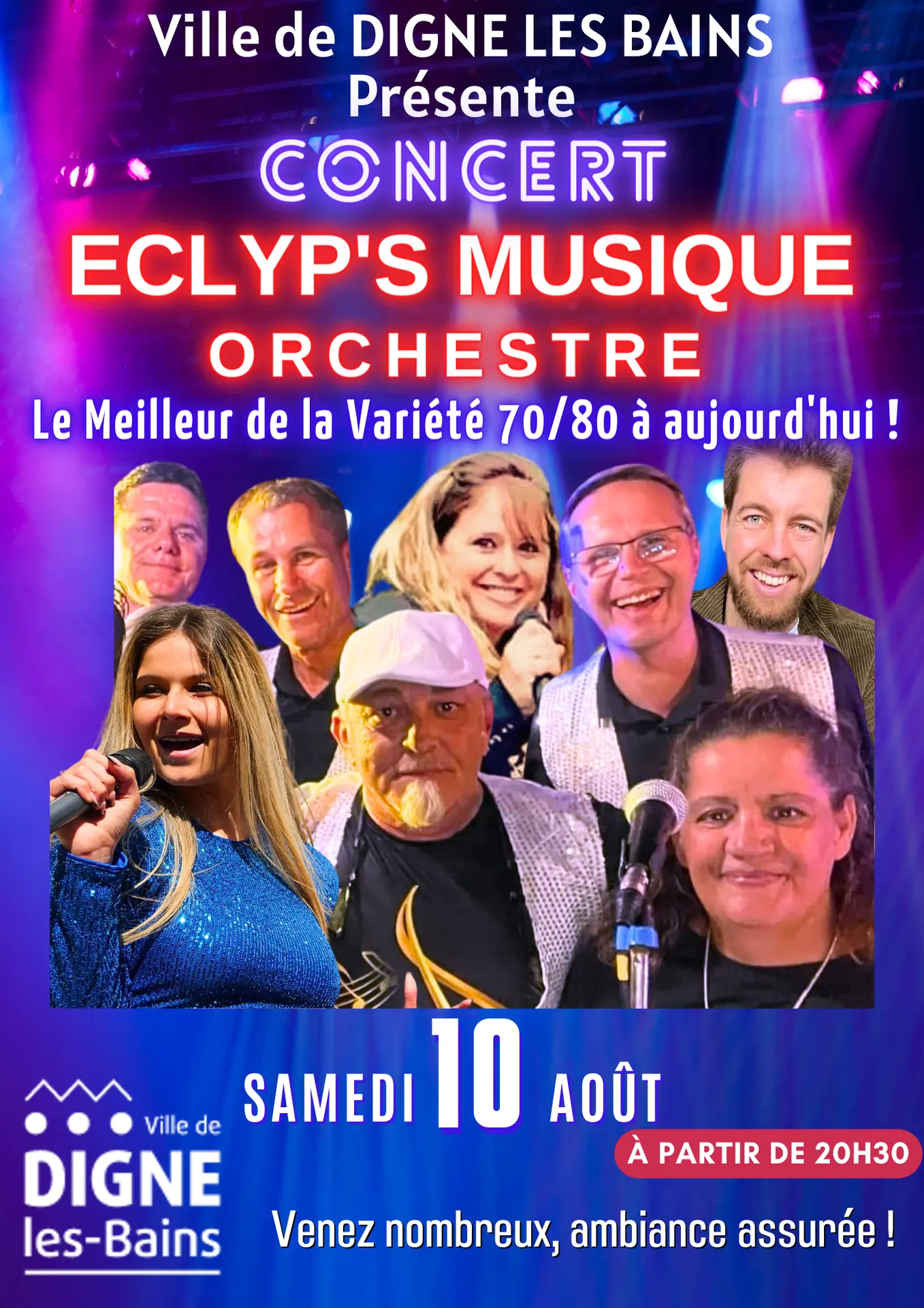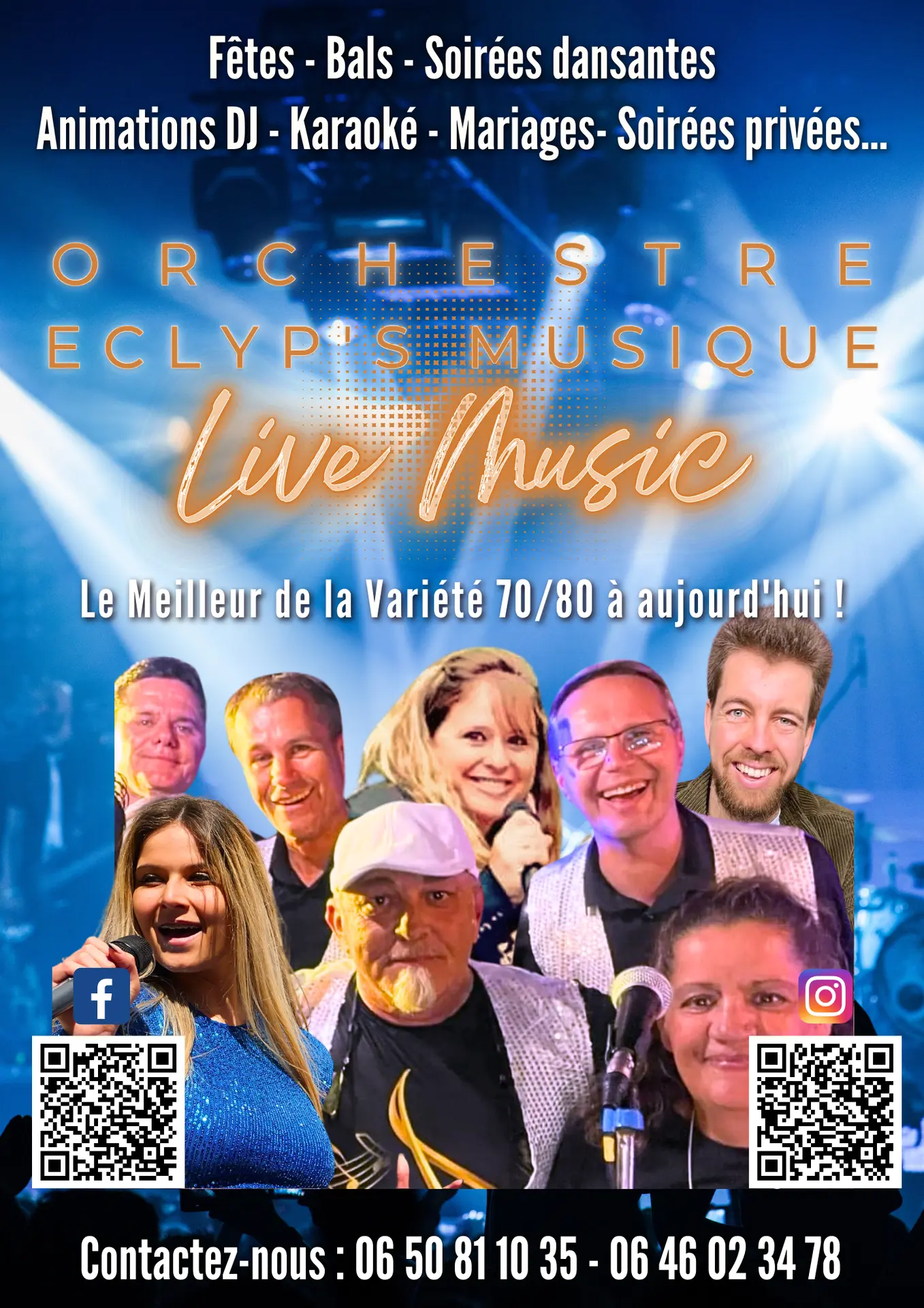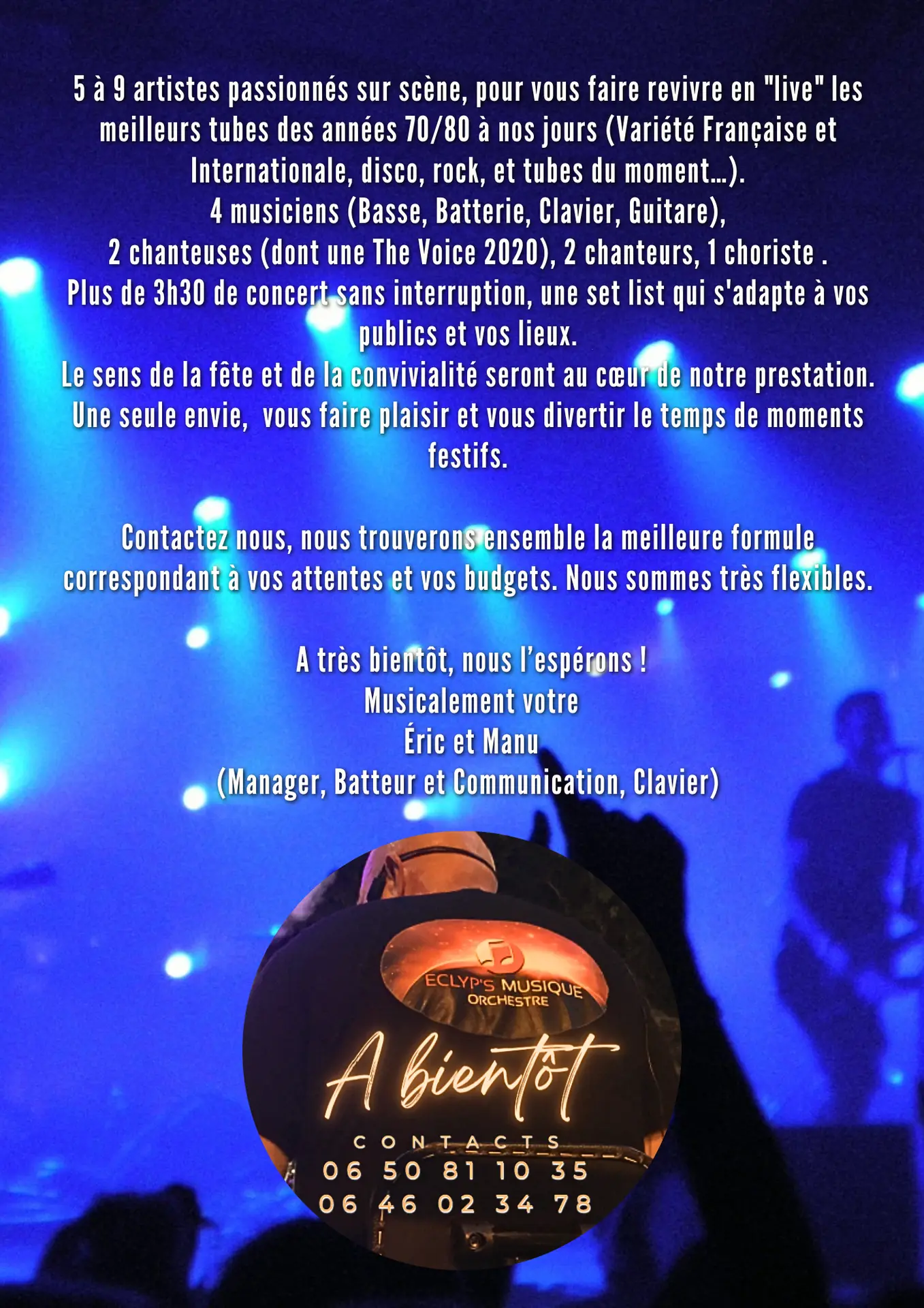 8 artistes passionnés sur scène, pour vous faire revivre en "live" les meilleurs tubes des années 70/80 à nos jours (Variété Française et Internationale, disco, rock, et tubes du moment…).