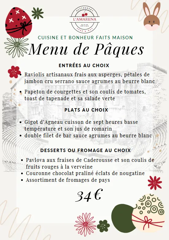 Le restaurant L'Amarena vous propose son menu de Pâques qui sera servi dimanche 20 et lundi 21, midi et soir.