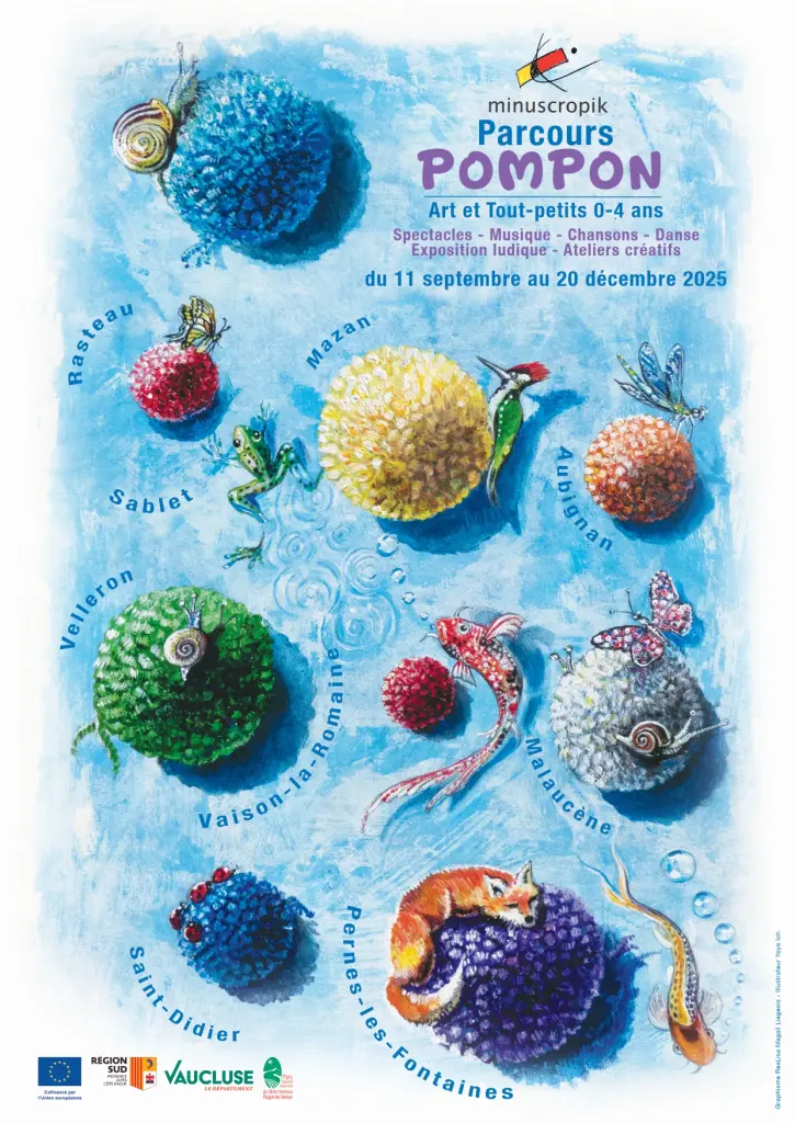 Ce spectacle fait partie du « parcours Pompon », qui s’inscrit dans une dynamique d’Éveil culturel et artistique destiné aux enfants de 0 à 4 ans ainsi qu’aux adultes qui les accompagnent. Les classes de petite section de maternelles sont également invitées à participer. De septembre à décembre 2025, spectacles, ateliers créatifs enfant/parent, exposition déambulatoire et formation des professionnels Petite Enfance. Le « parcours Pompon » investit 4 communautés de communes du parc naturel régional du Ventoux, dans les villages de Aubignan, Malaucène, Mazan, Rasteau, Sablet, Saint Didier, Pernes-les-fontaines, Vaison-la-Romaine et Velleron. Programme complet ci-joint.