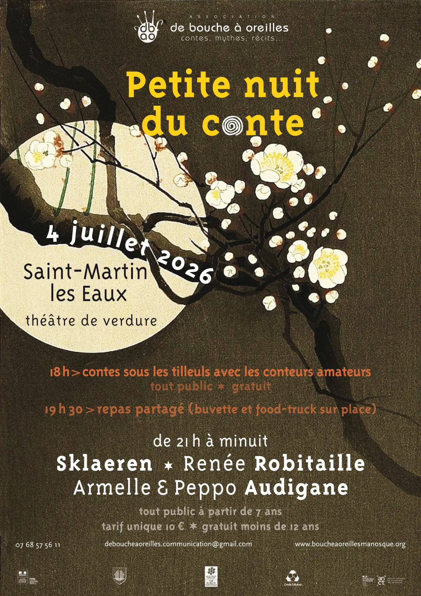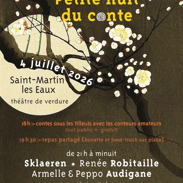 La semaine précédant la Petite Nuit du Conte elle animera un stage qui se conclura par une création collective en ouverture de la soirée à 18 h sous les tilleuls de Saint-Martin-les-Eaux.