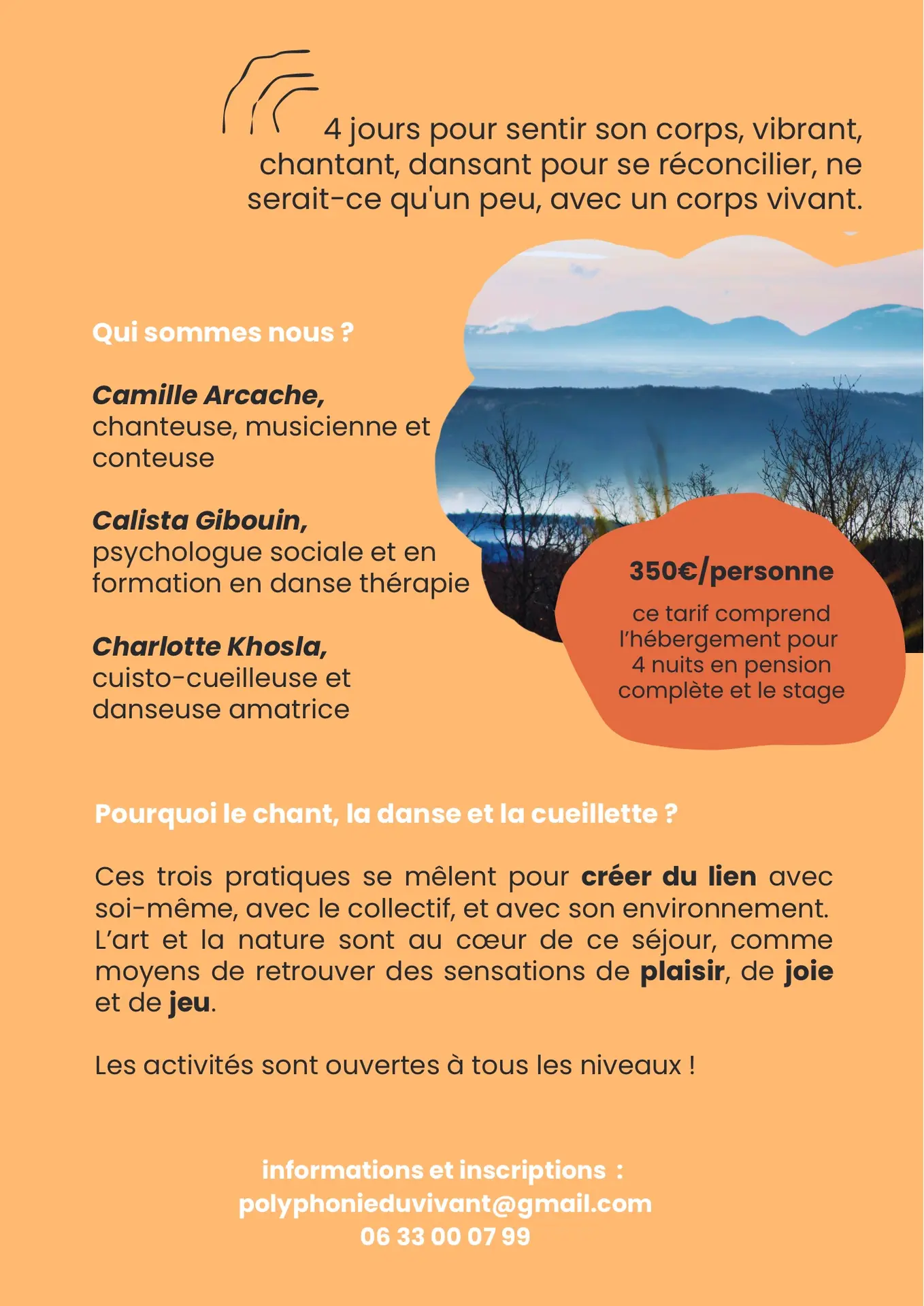 Un séjour de 3 jours en pension complète qui allie chant, danse, et cueillette de plantes sauvages à destination d’un public concerné par les troubles des conduites alimentaires