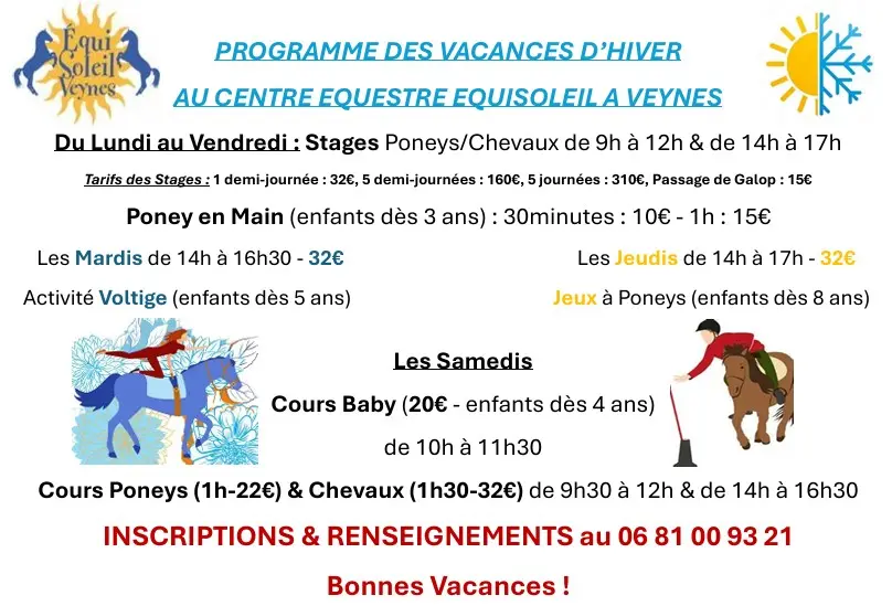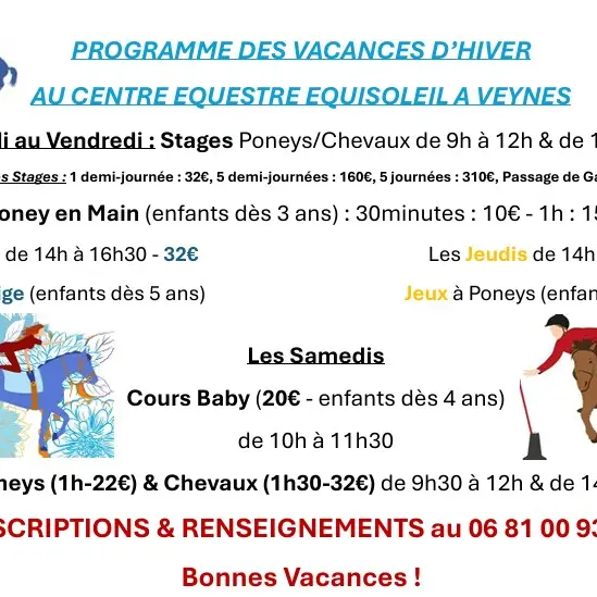 Programme des diverses activités proposées durant les vacances d'hiver au centre équestre EquiSoleil.