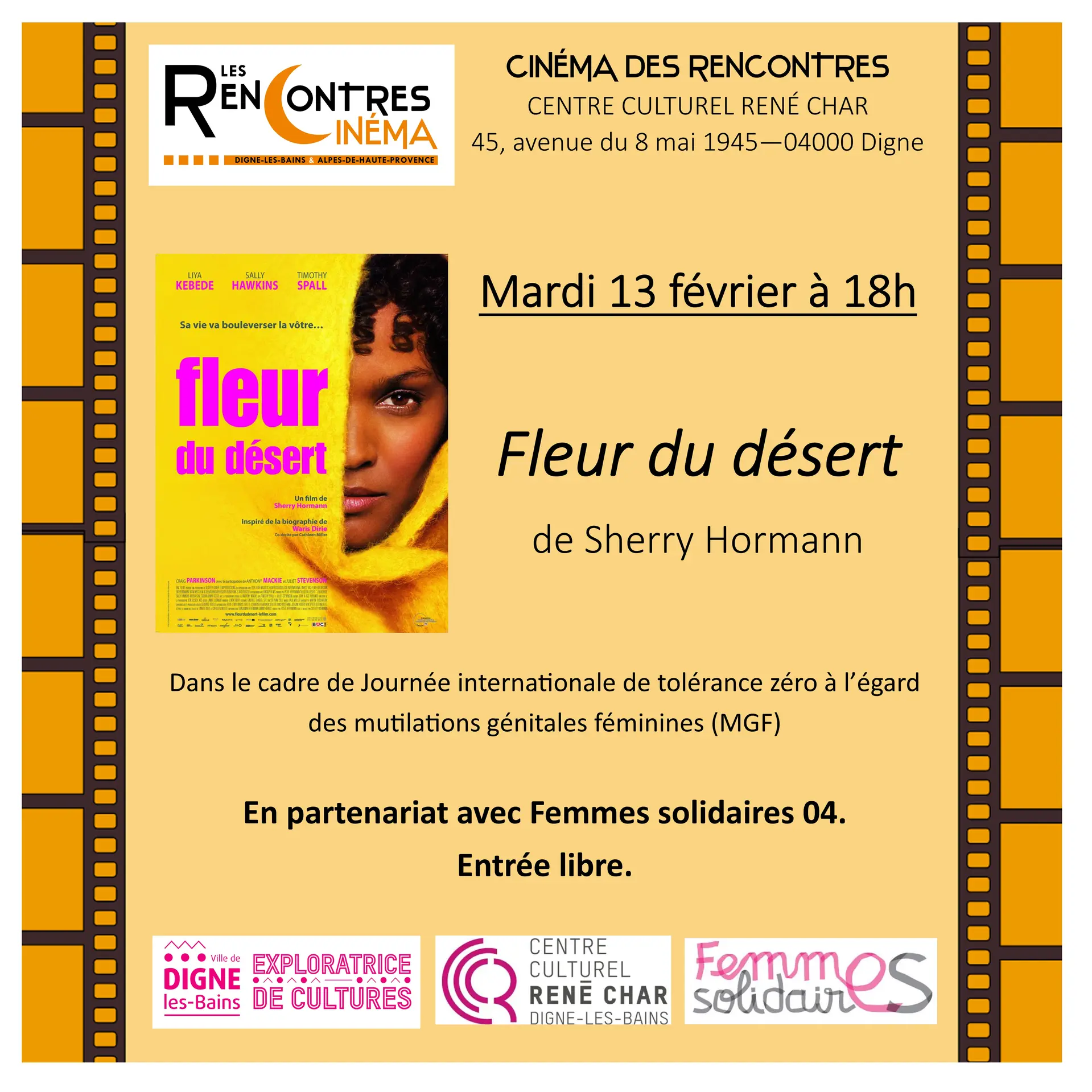 Les Rencontres cinéma et l'association Femmes solidaires 04 proposent une projection du film "Fleur du désert". Entrée libre.
