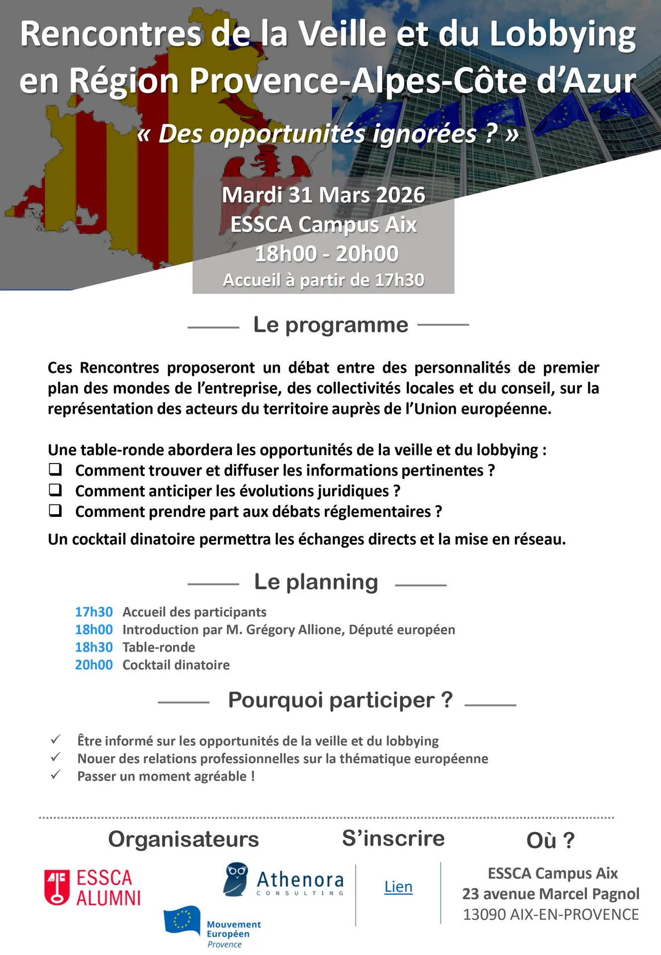 Ces Rencontres proposeront un débat entre des personnalités de premier plan des mondes de l’entreprise, des collectivités locales et du conseil, sur la représentation des acteurs du territoire auprès de l’Union européenne.