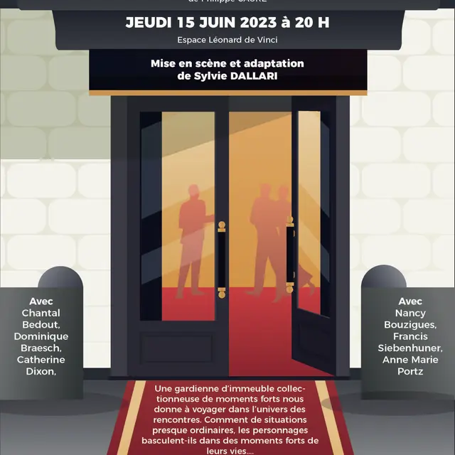 La troupe de théâtre du Centre Culturel Municipal interprète le jeudi 15 juin à 20h à l’Espace Léonard de Vinci la pièce « Rencontres peu ordinaires » de Philippe Caure, Mise en scène et adaptée par Sylvie Dallari. Le pitch : « Une gardienne d’immeuble collectionneuse de moments forts nous donne à voyager dans l’univers des rencontres.