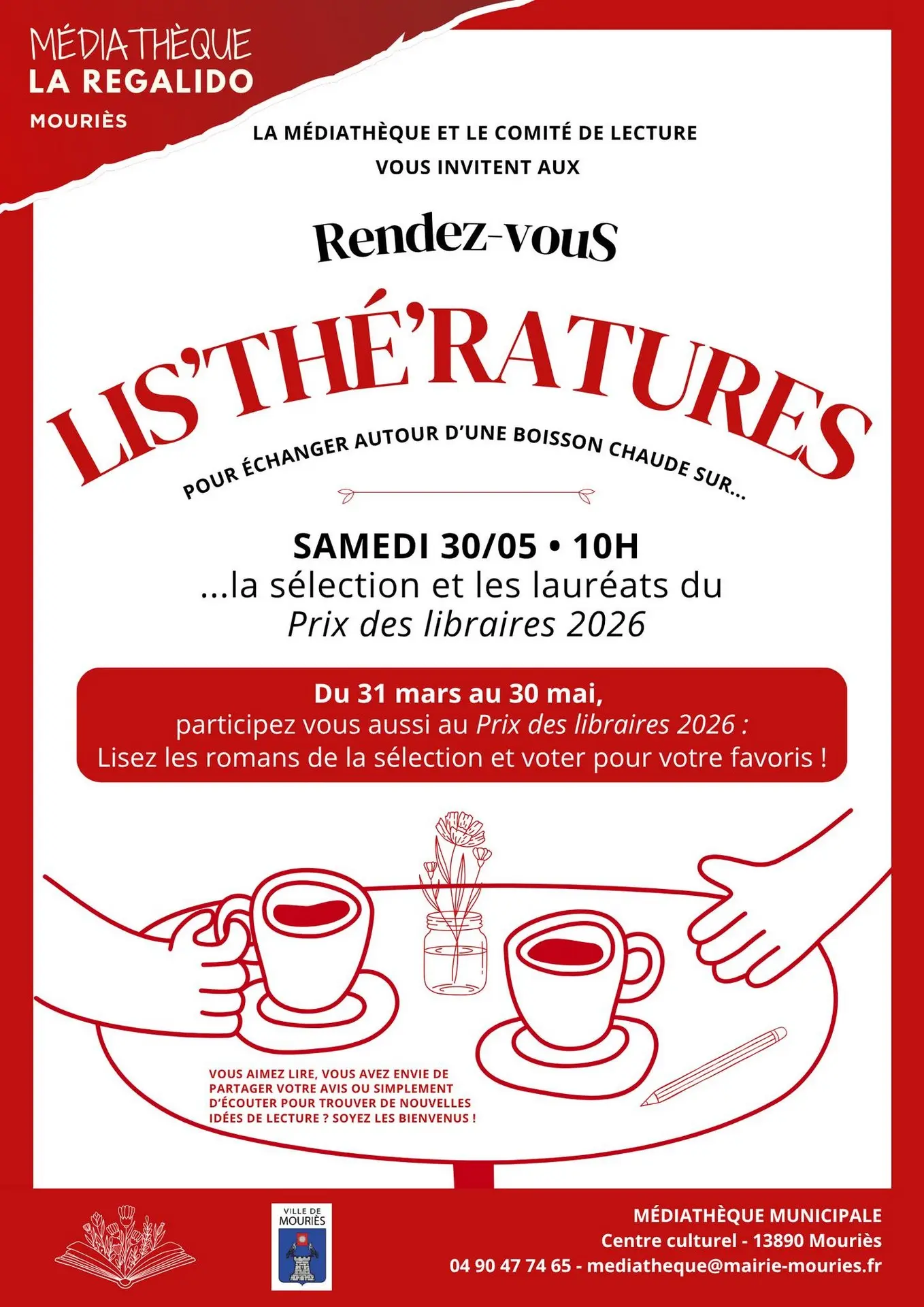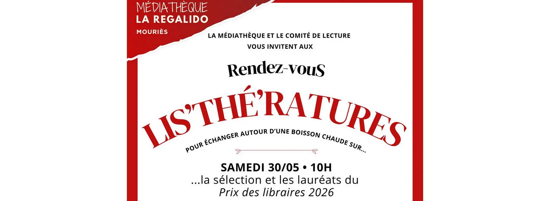 La Médiathèque de Mouriès vous invite à son Rendez-vous Lis'Thé'Ratures, le samedi 30 mai à 10h !