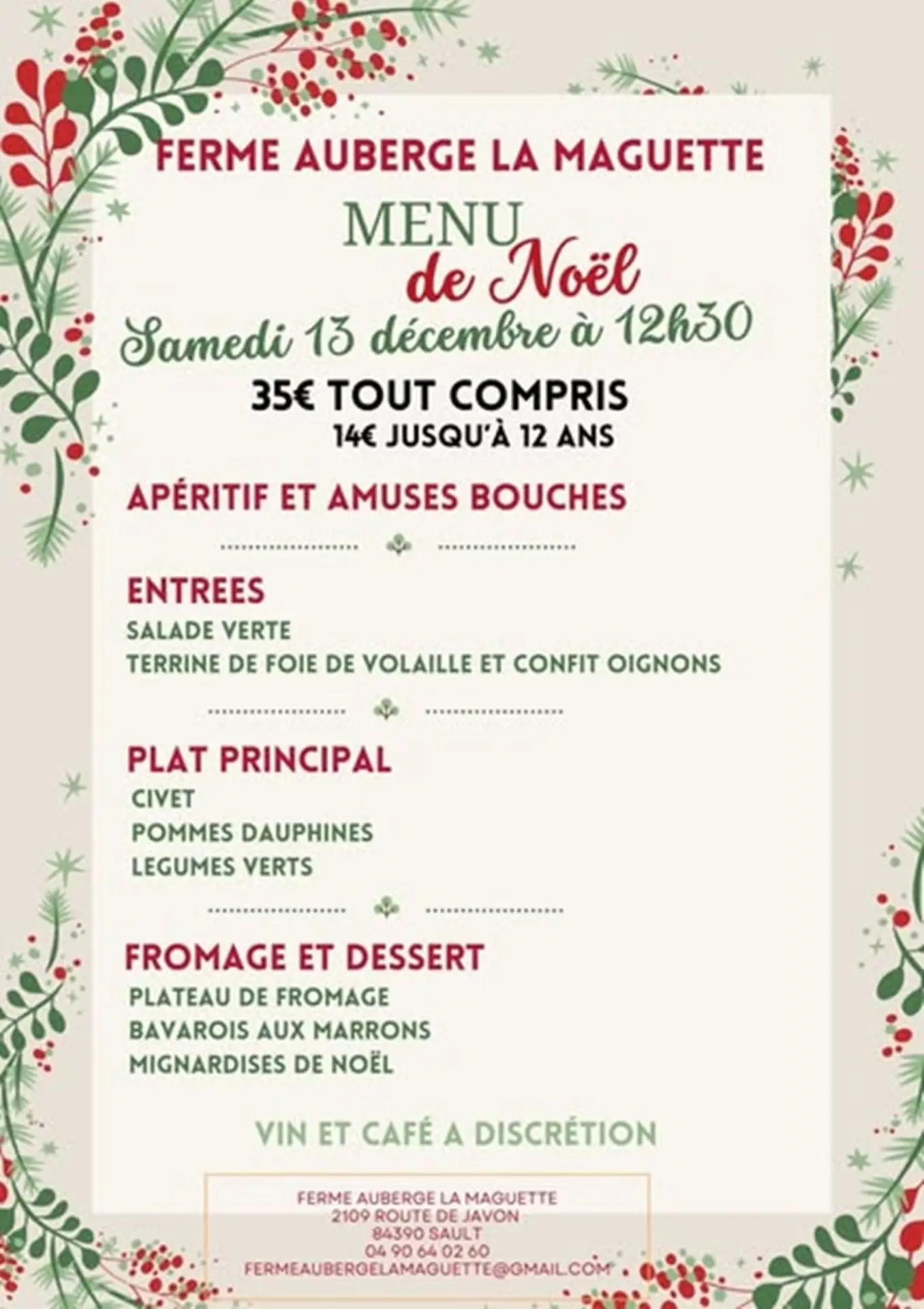 Avant le véritable Noël venez déjà vous mettre dans l'ambiance aux saveurs de Noël autour d'un bon repas à la Ferme Auberge la Maguette.
