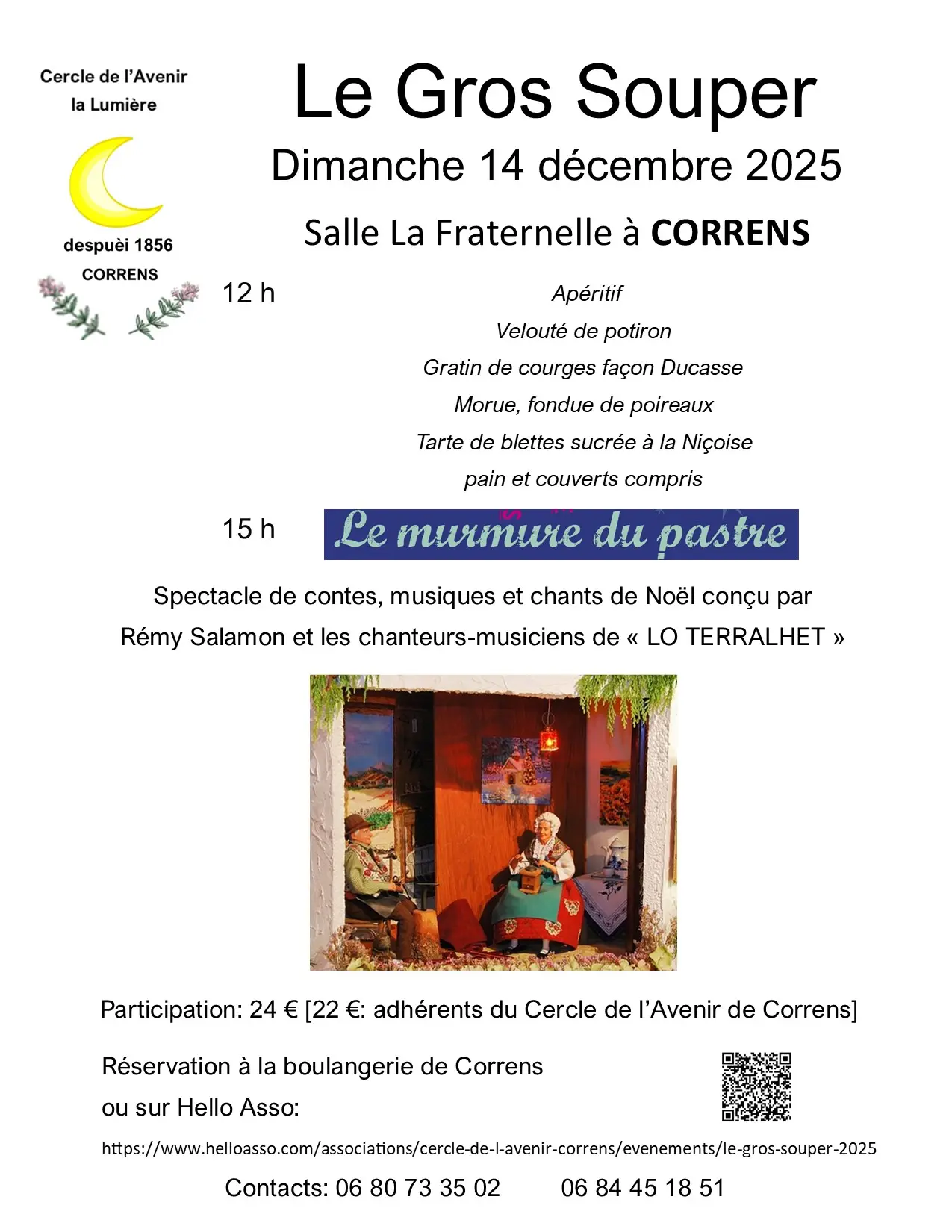 le traditionnel gros souper vous est proposé. Au menu : Apéritif, gratin de courge façon Ducasse, morue, fondue de poireaux, tarte de blettes sucrée à la niçoise, pain et couverts compris
