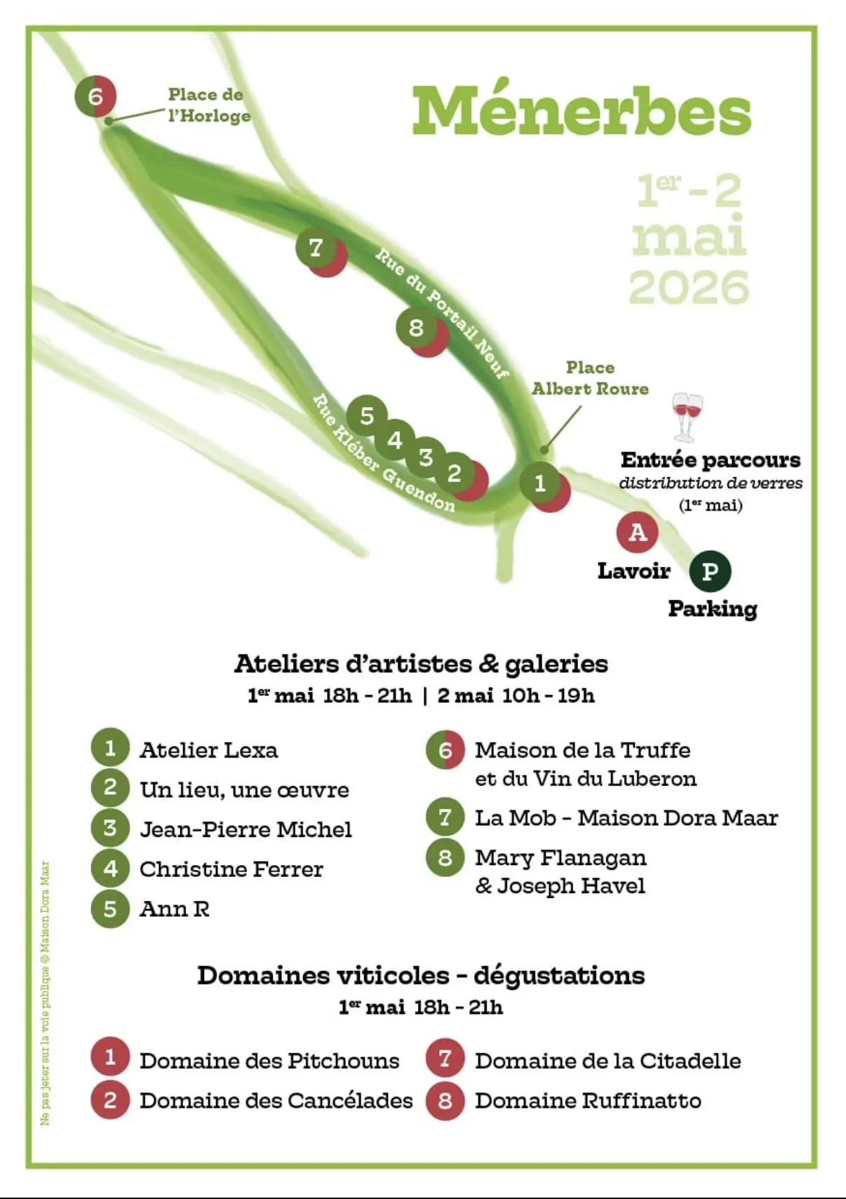 Une découverte des lieux et des oeuvres des artistes de Ménerbes. Des dégustations de vins dans les différents lieux et la possibilité d'acheter les vins au prix des domaines et déguster planches et mets gourmands à la Maison de la Truffe et du Vins du Luberon. Prêt de verres à vin (3euros la consigne) à l'entrée du parcours, place Rossignol.