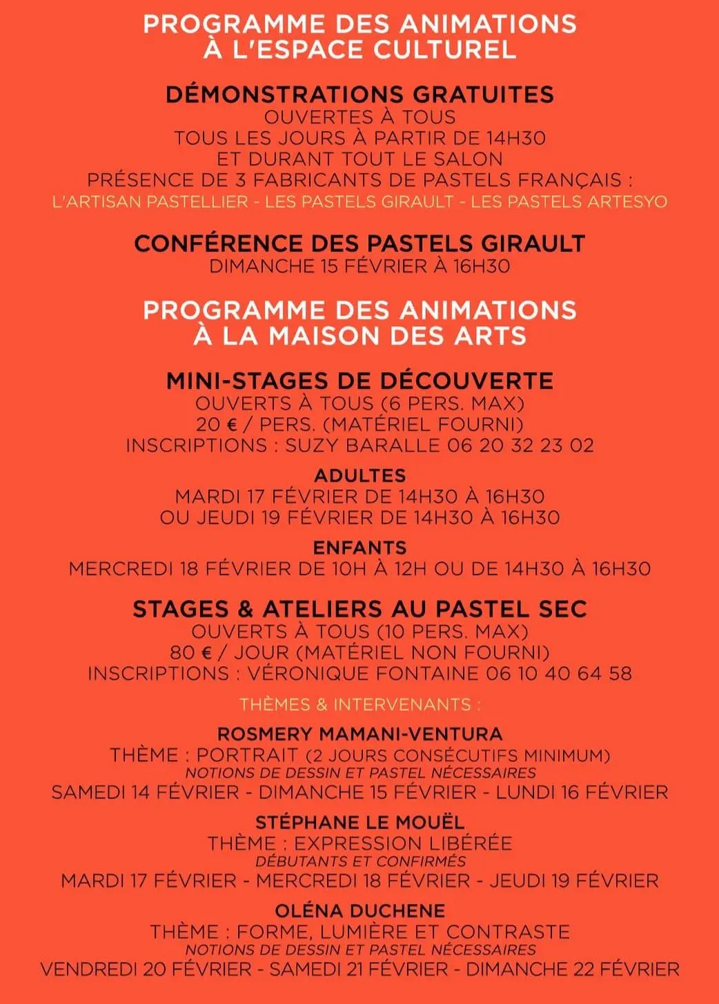 - Mardi 17 de 14h à 16h : mini stage découverte adultes (matériel fourni) 6 personnes maximum participation 20€.