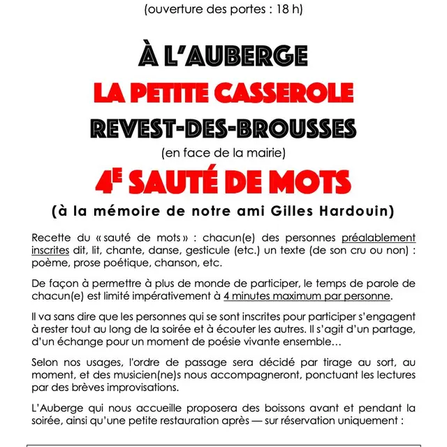Scène ouverture pour tout public. Recette du "sauté de mots" : chacun(e) des personnes préalablement inscrites dit, lit, chante, danse, gesticule etc... un texte (de son cru ou non) : poème, prose poétique, chanson, etc.