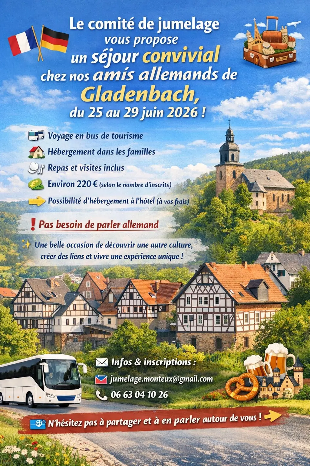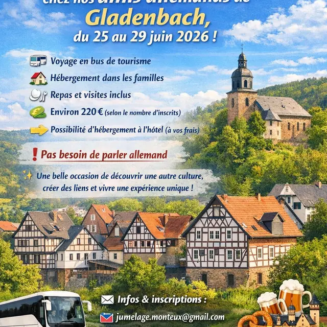 Le comité de jumelage vous propose un séjour convivial chez nos amis allemands de Gladenbach. Voyage en bus de tourisme, hébergement dans les familles, repas et visites inclus.