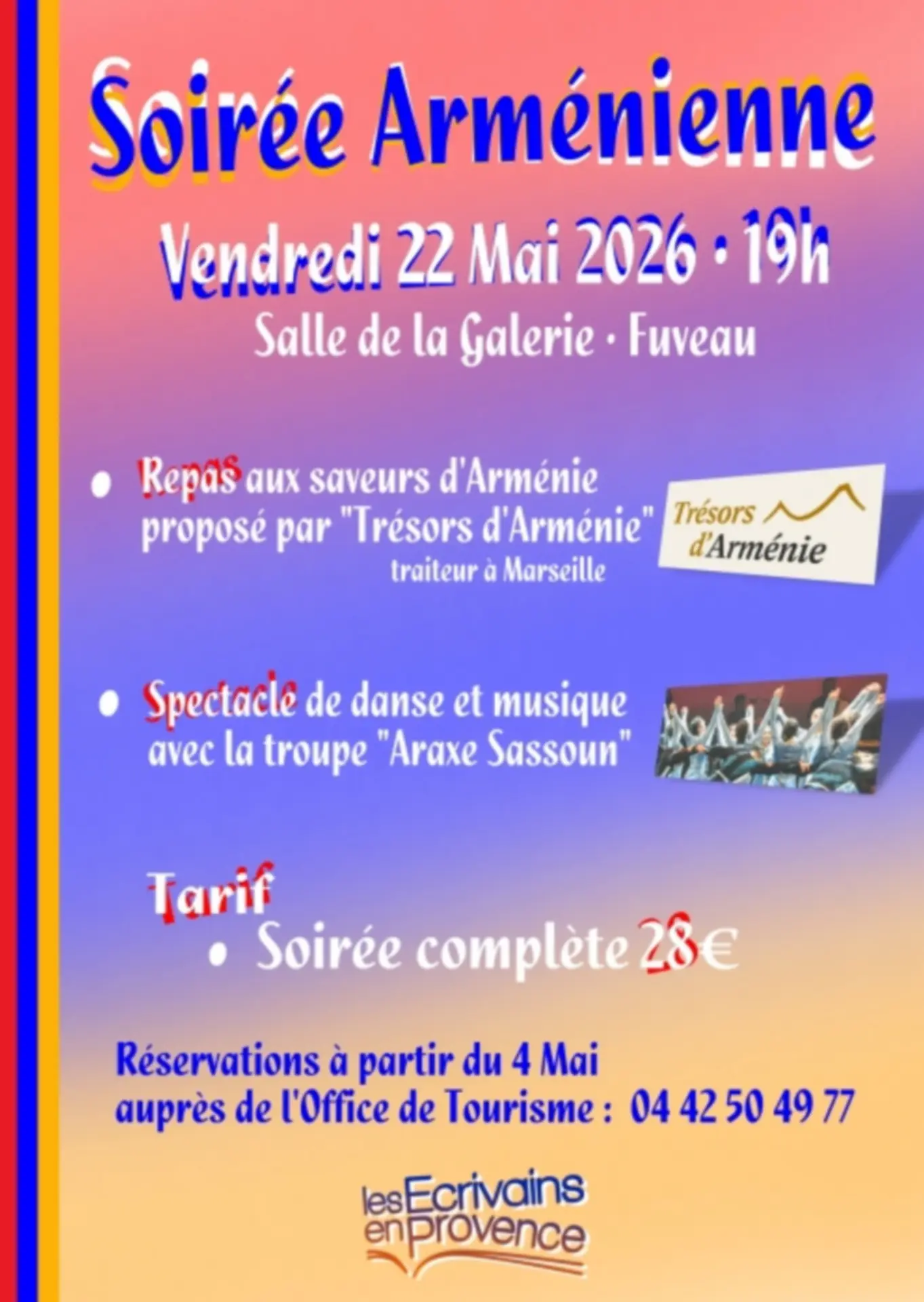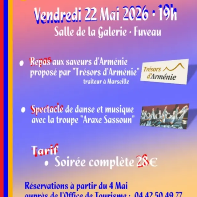 Une soirée arménienne avec un repas aux saveurs d'Arménie" et un spectacle de la troupe "Araxe Sassoun" avec ses danseurs et ses musiciens.