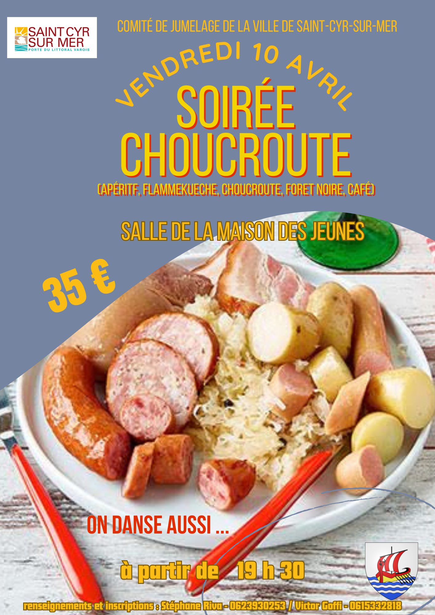 Le comité de jumelage de la ville de Saint-Cyr-sur-Mer vous propose de participer à la soirée Choucroute qui aura lieu à la salle de la maison des jeunes.