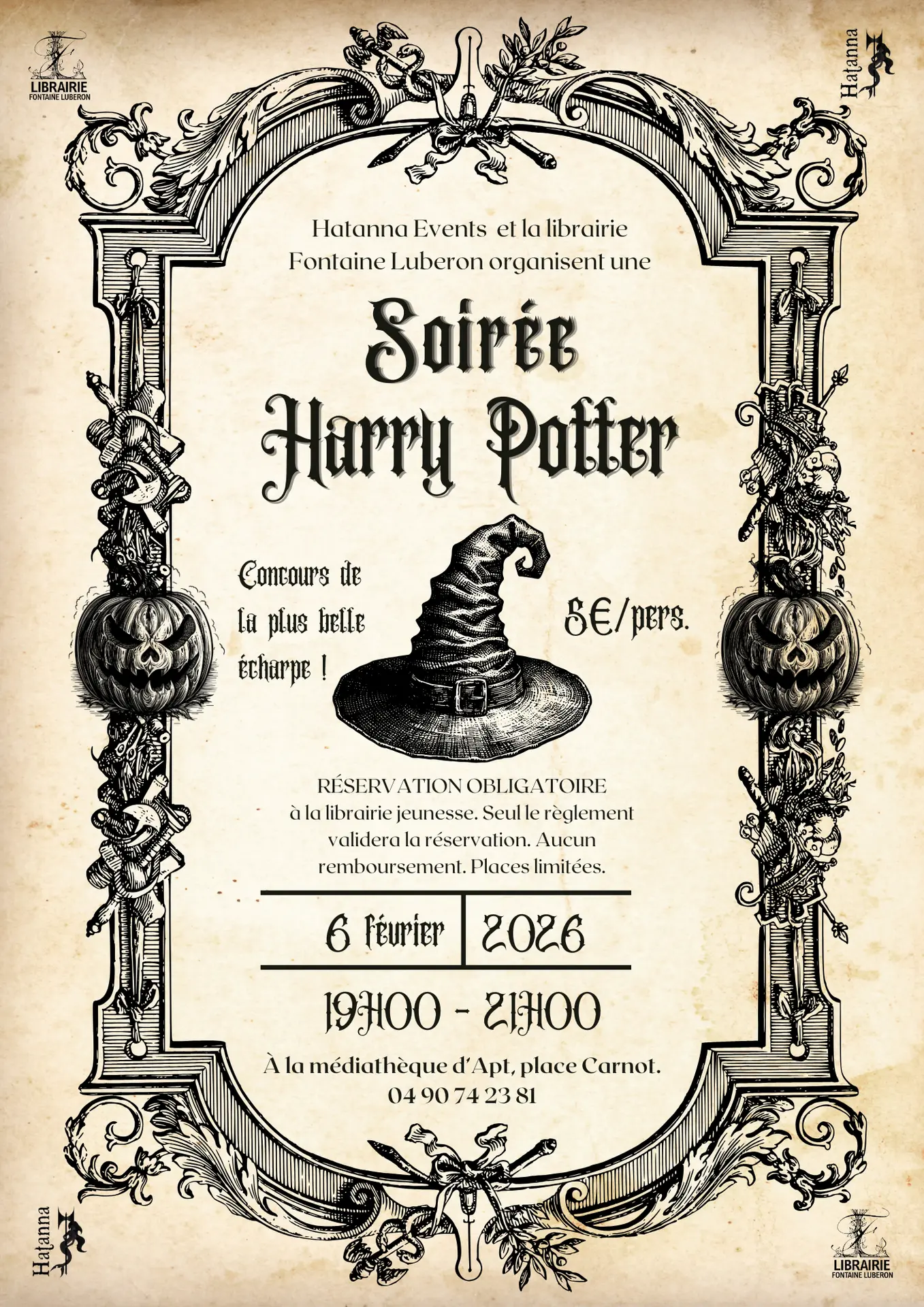 Rendez-vous le vendredi 6 février de 19h à 21h à la médiathèque d'Apt pour une soirée ensorcelée. Réservation obligatoire préalablement à la librairie fontaine jeunesse. 5€/pers. Concours de la plus belle écharpe de sorcier.