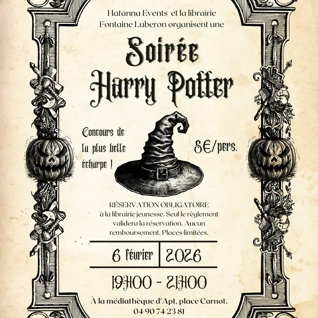Rendez-vous le vendredi 6 février de 19h à 21h à la médiathèque d'Apt pour une soirée ensorcelée. Réservation obligatoire préalablement à la librairie fontaine jeunesse. 5€/personne, non remboursable. Concours de la plus belle écharpe de sorcier. Chacun peut mener quelque chose à boire ou à manger afin de partager un moment convivial entre deux sessions de quiz.