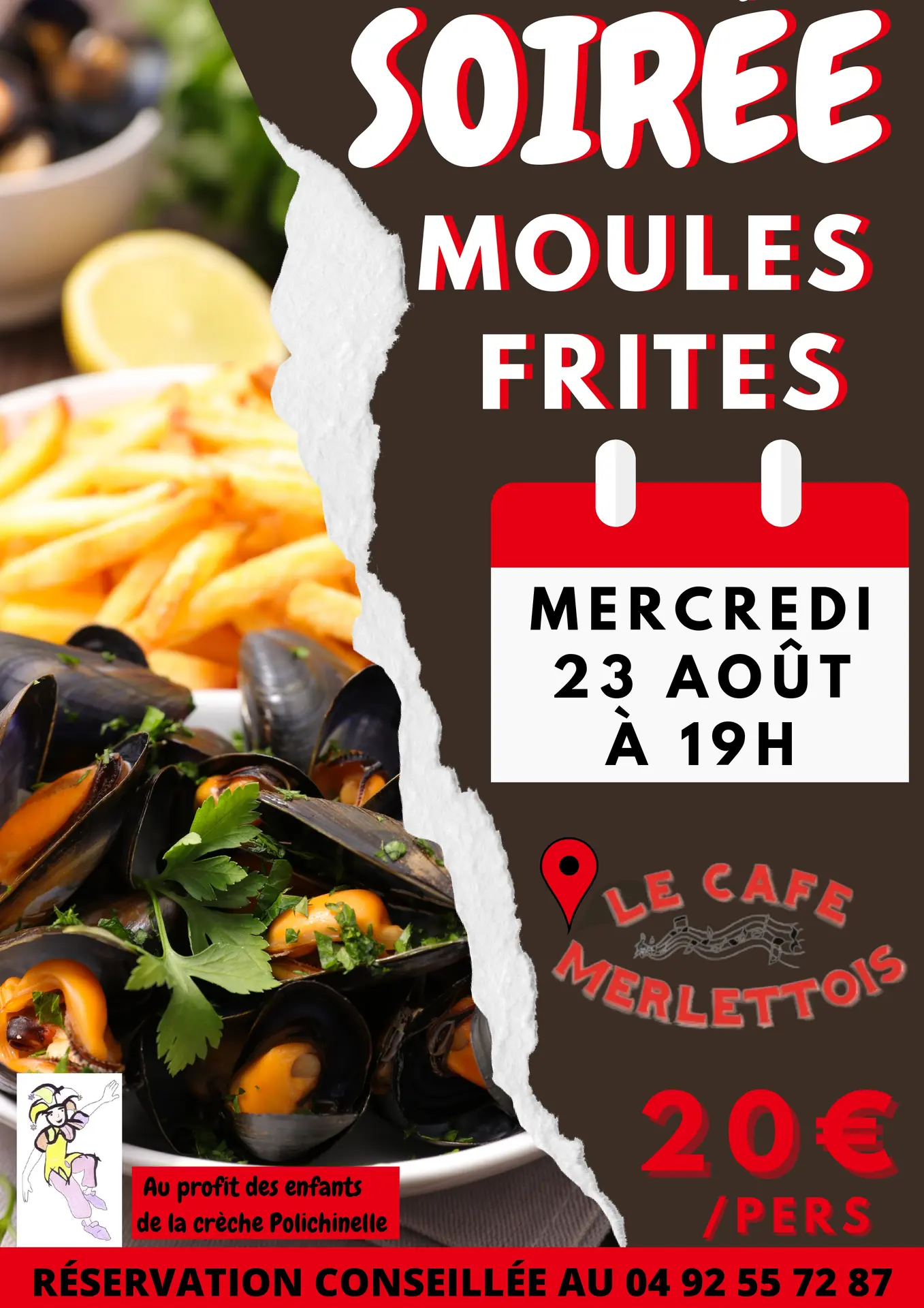 Le Café Merlettois vous attend pour une soirée moules-frites, le 23 août 2023 à partir de 19h. Un moment conviviale au profit des enfants de la crèche Polichinelle !