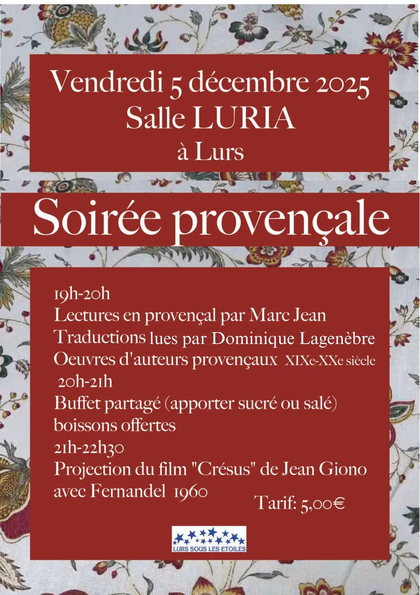 19h-20h : lectures de nouvelles en provençal et traduites en français (auteurs locaux XIXe-XXe siècle ). Buffet provençal à partager où chacun apportera sa contribution salée ou sucrée. 21h-22h30 : projection du film "Crésus" de Jean Giono (1960)