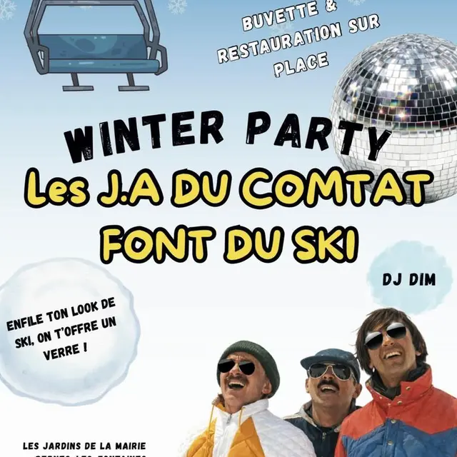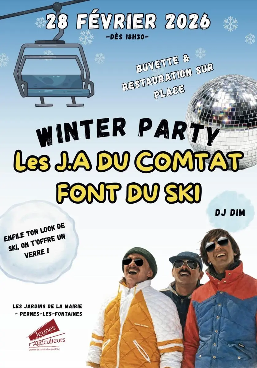 Soirée "Winter Party : Les J.A du Comtat font du ski" organisée par les jeunes agriculteurs du Comtat sur le thème du ski, à partir de 18h30 dans les Jardins de la Mairie. Enfile ton look de ski, on t'offre un verre !