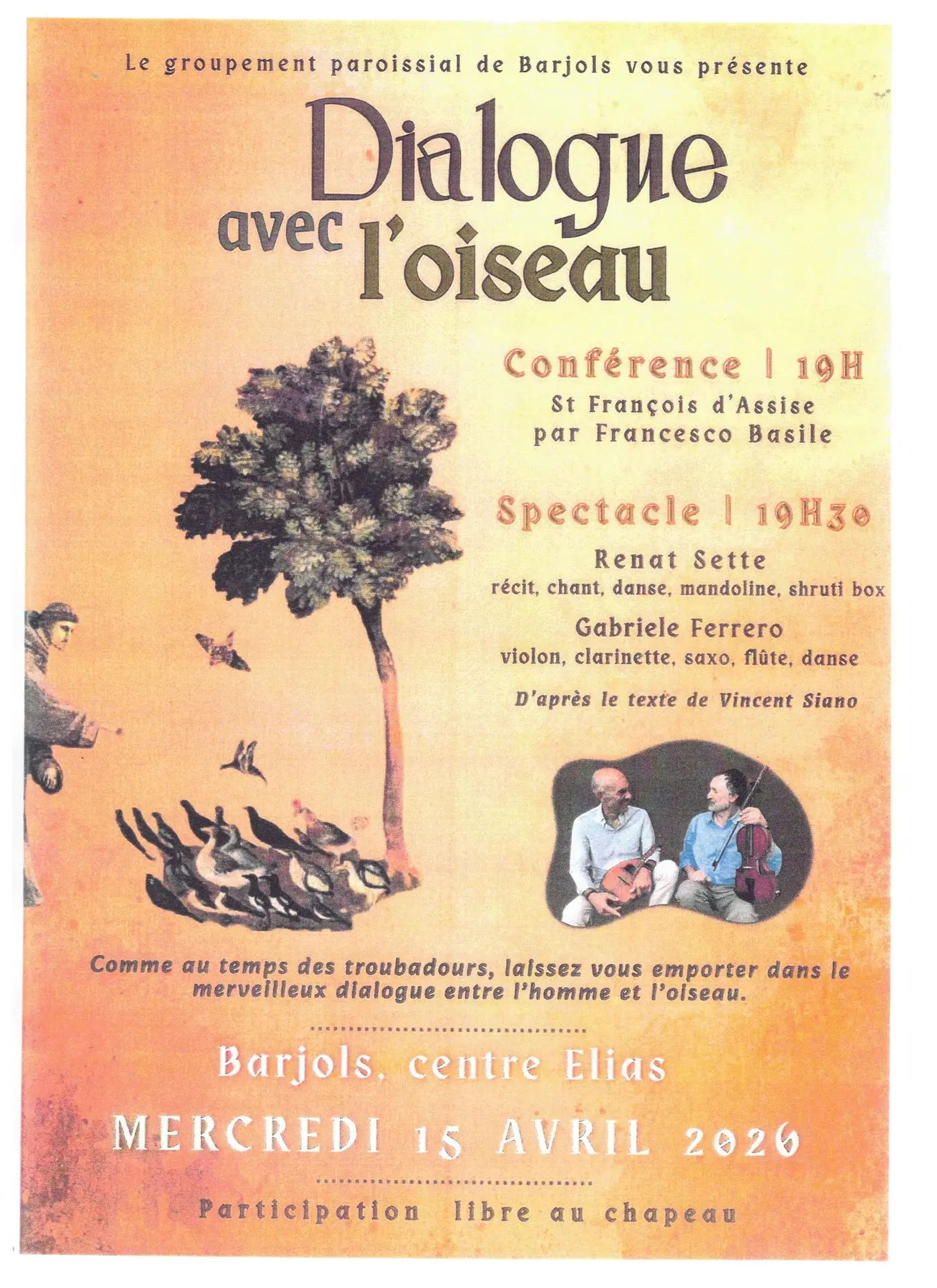 Conférence autour de Saint François d'Assise à 19h puis, dès 19h30 place à Renat Sette et Gabrielle Ferro pour des chants, musiques et danses autour des textes de Vincent Siano. Comme au temps des troubadours, l'homme dialoguera avec l'oiseau.