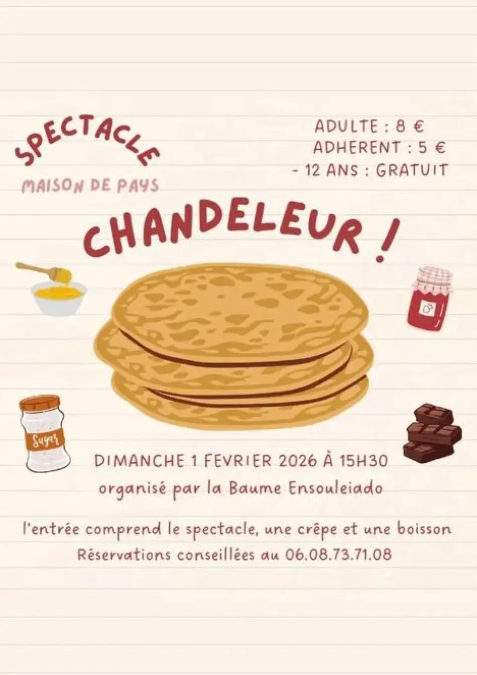Venez célébrer la chandeleur. L'entrée comprend le spectacle (chanteur Cheche du groupe Tchapaclan qui va interpréter des chansons de variété française ), une crêpe et une boisson